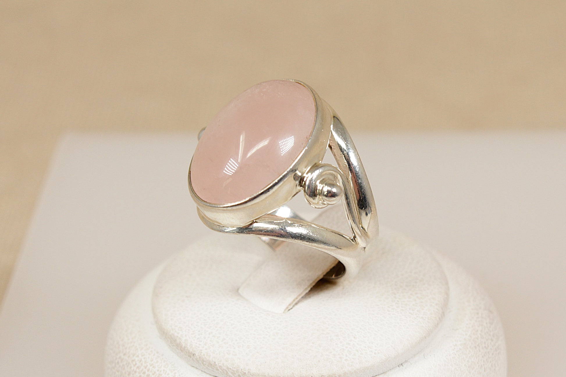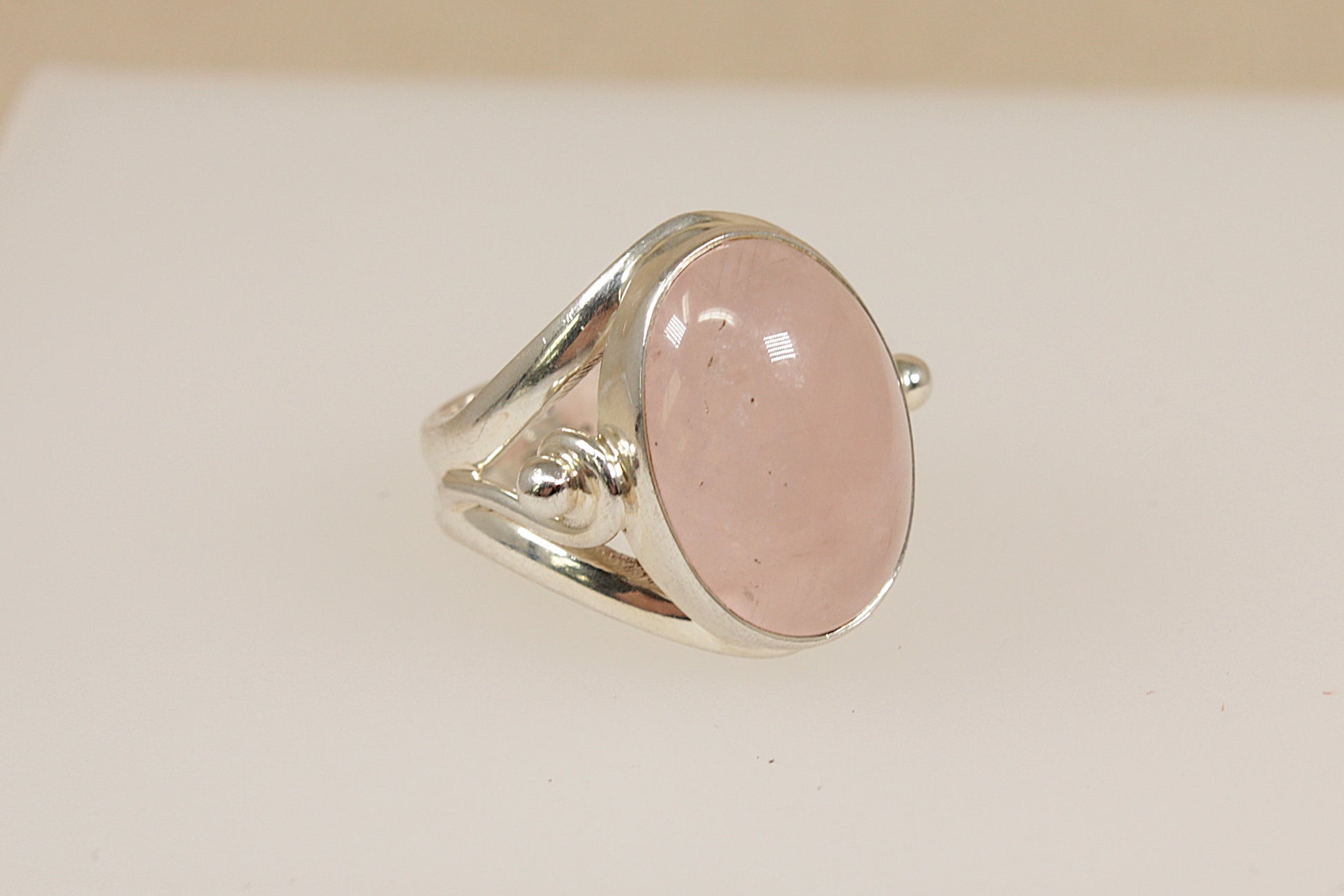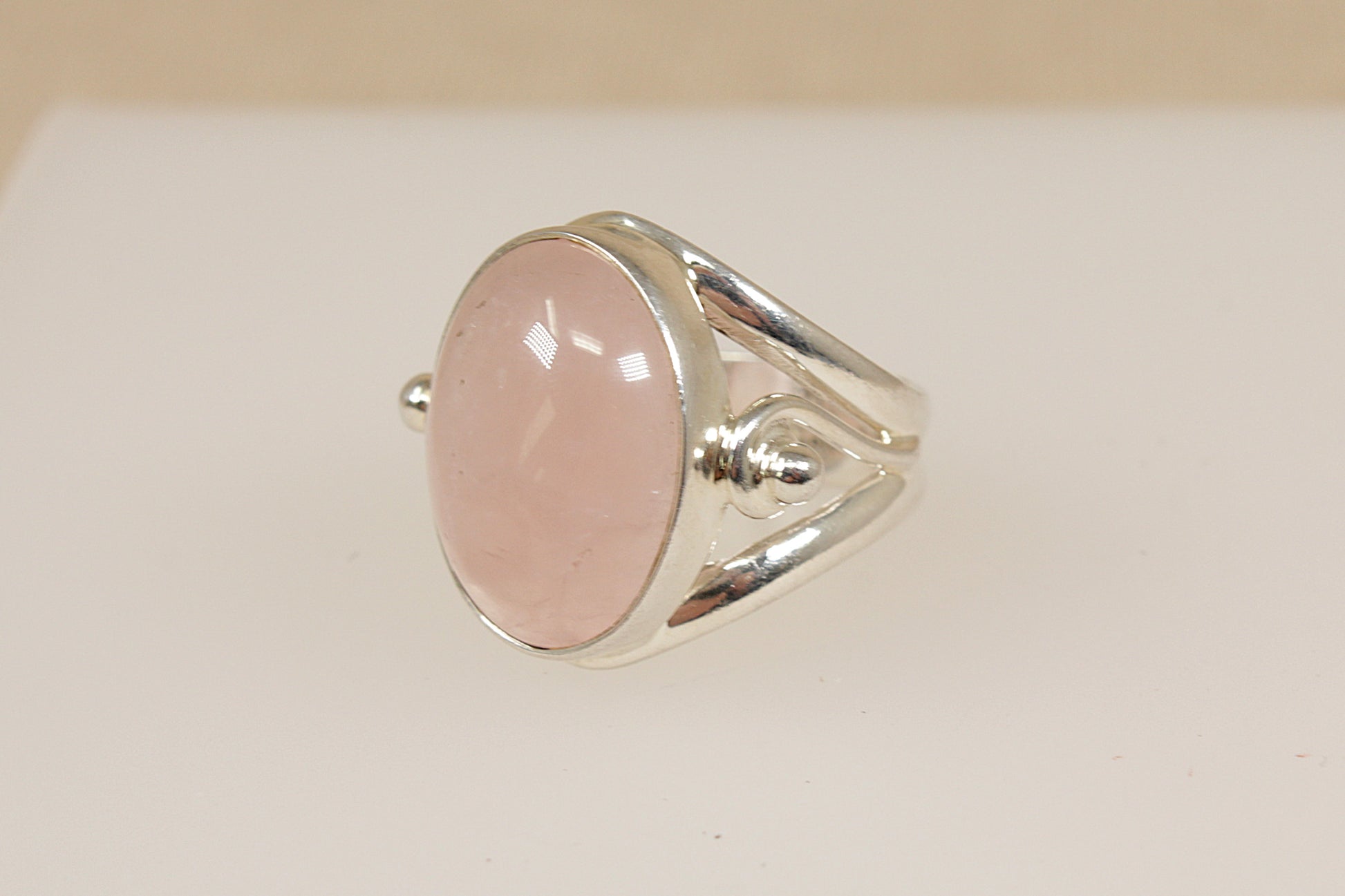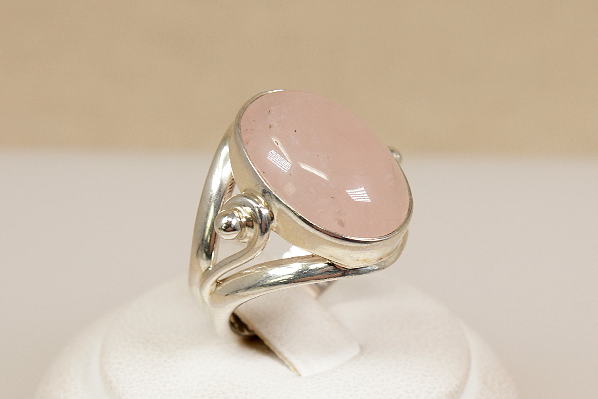 This eye-catching Sterling Silver ring features a large oval cabochon-cut Pink Quartz gemstone, in a secure bezel setting to showcase the stone’s soft blush hue and smooth finish.