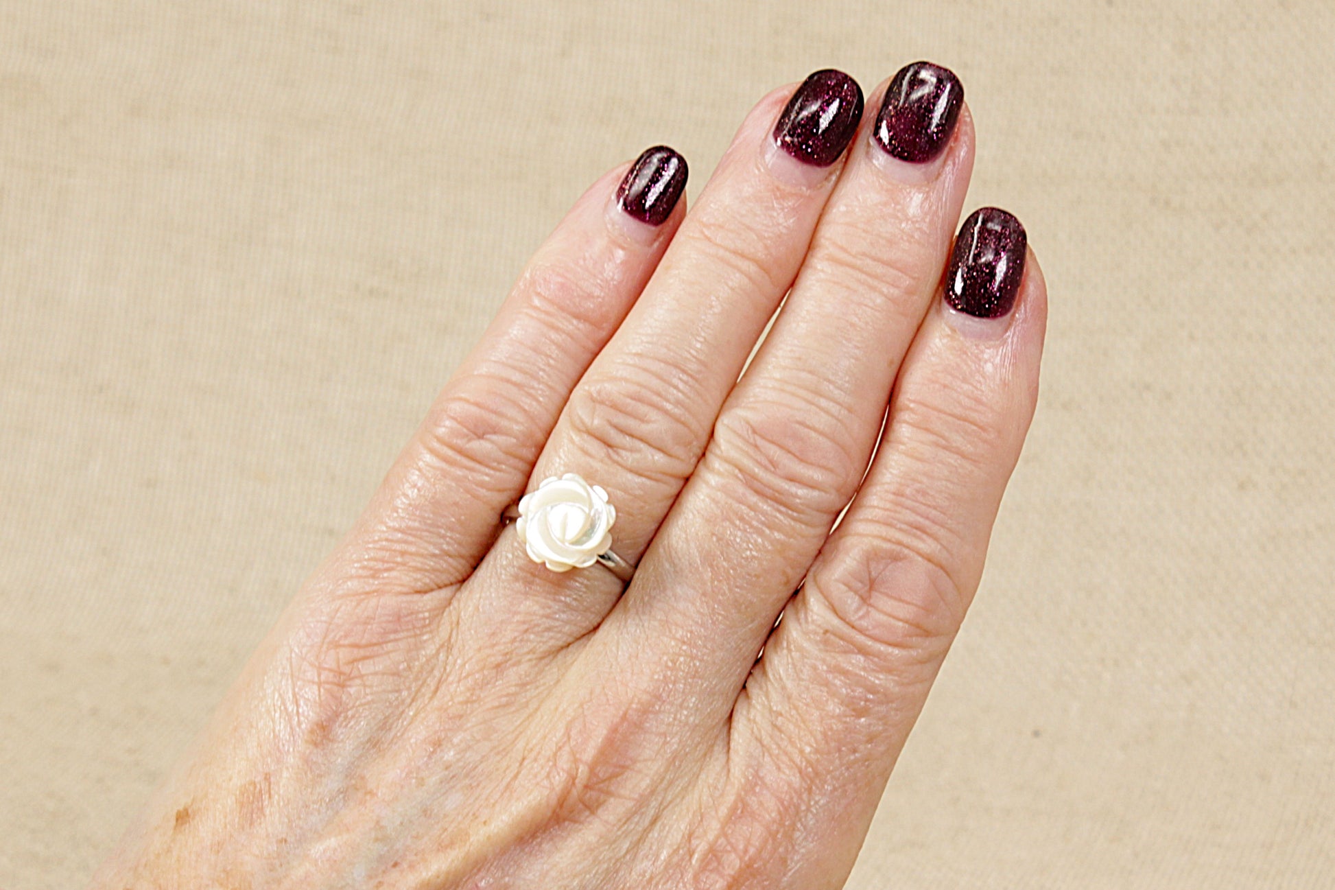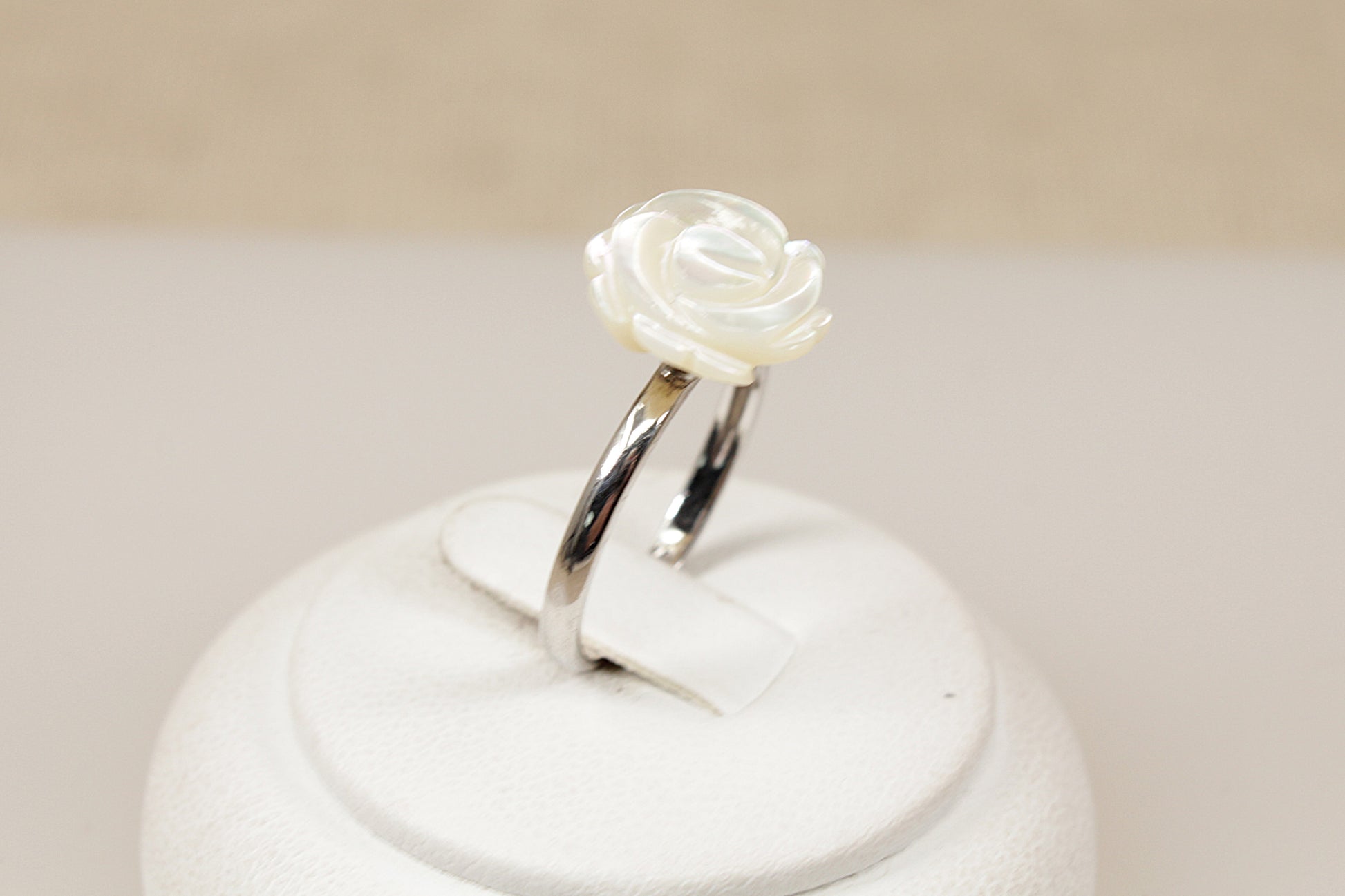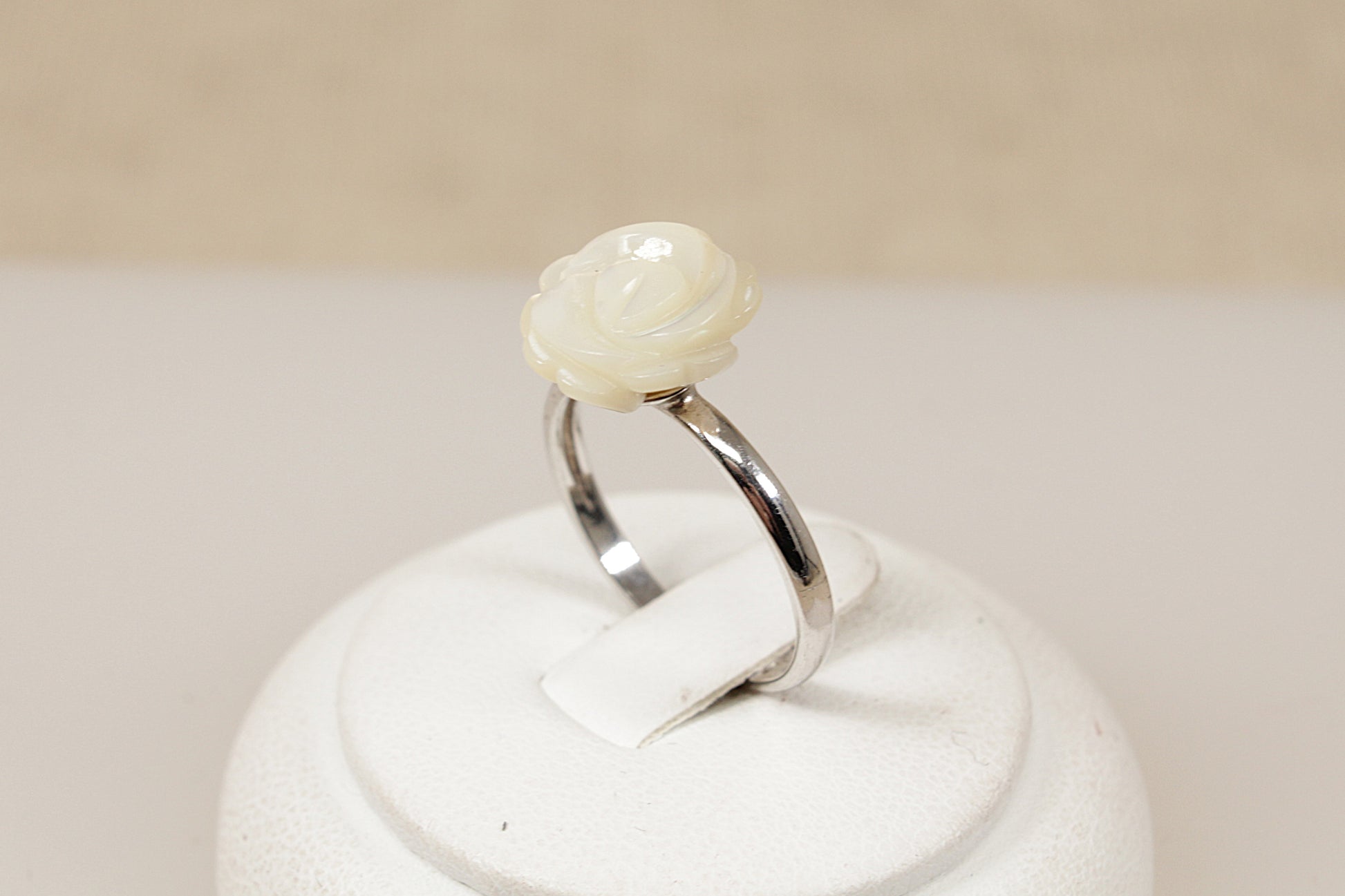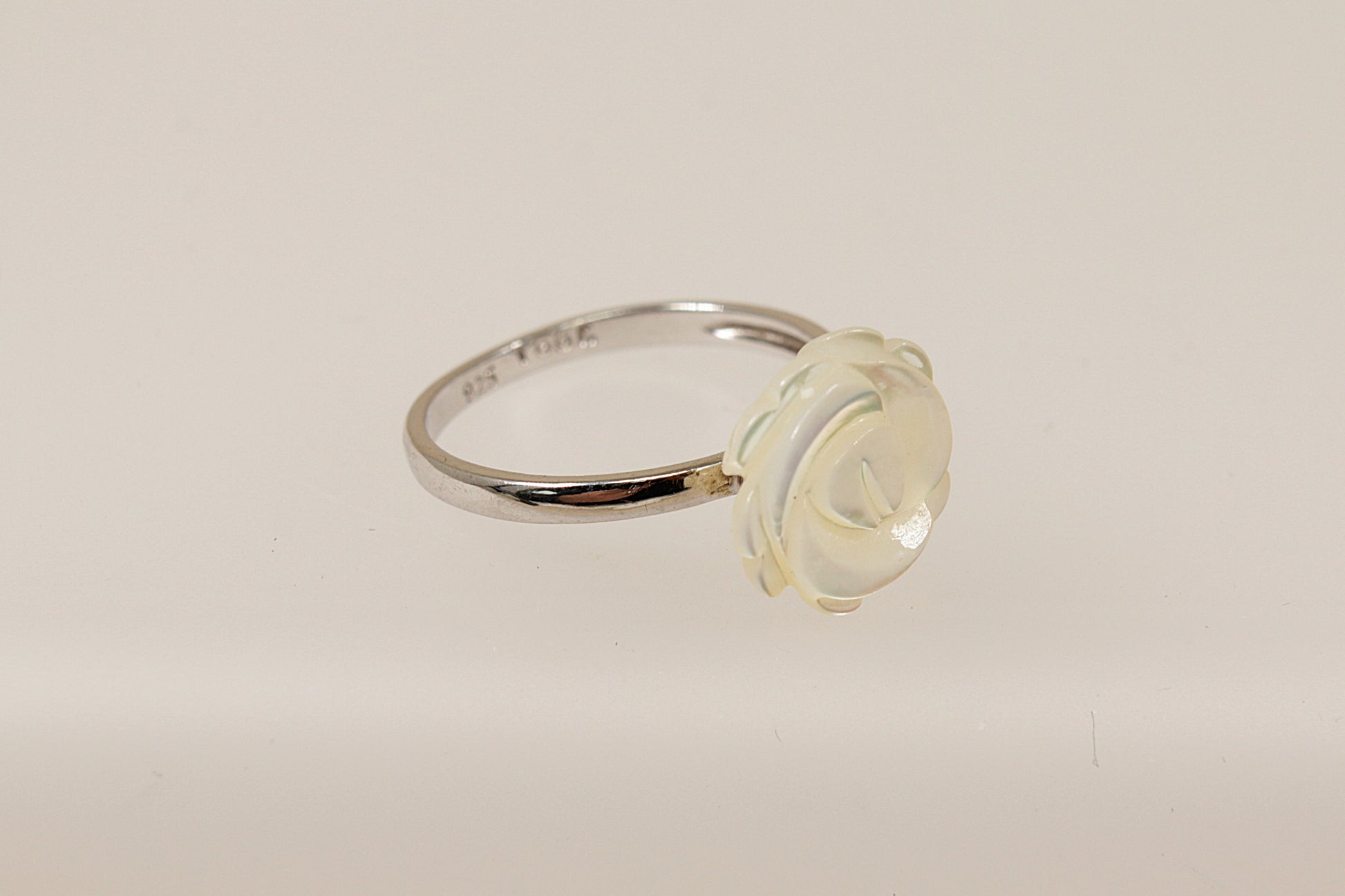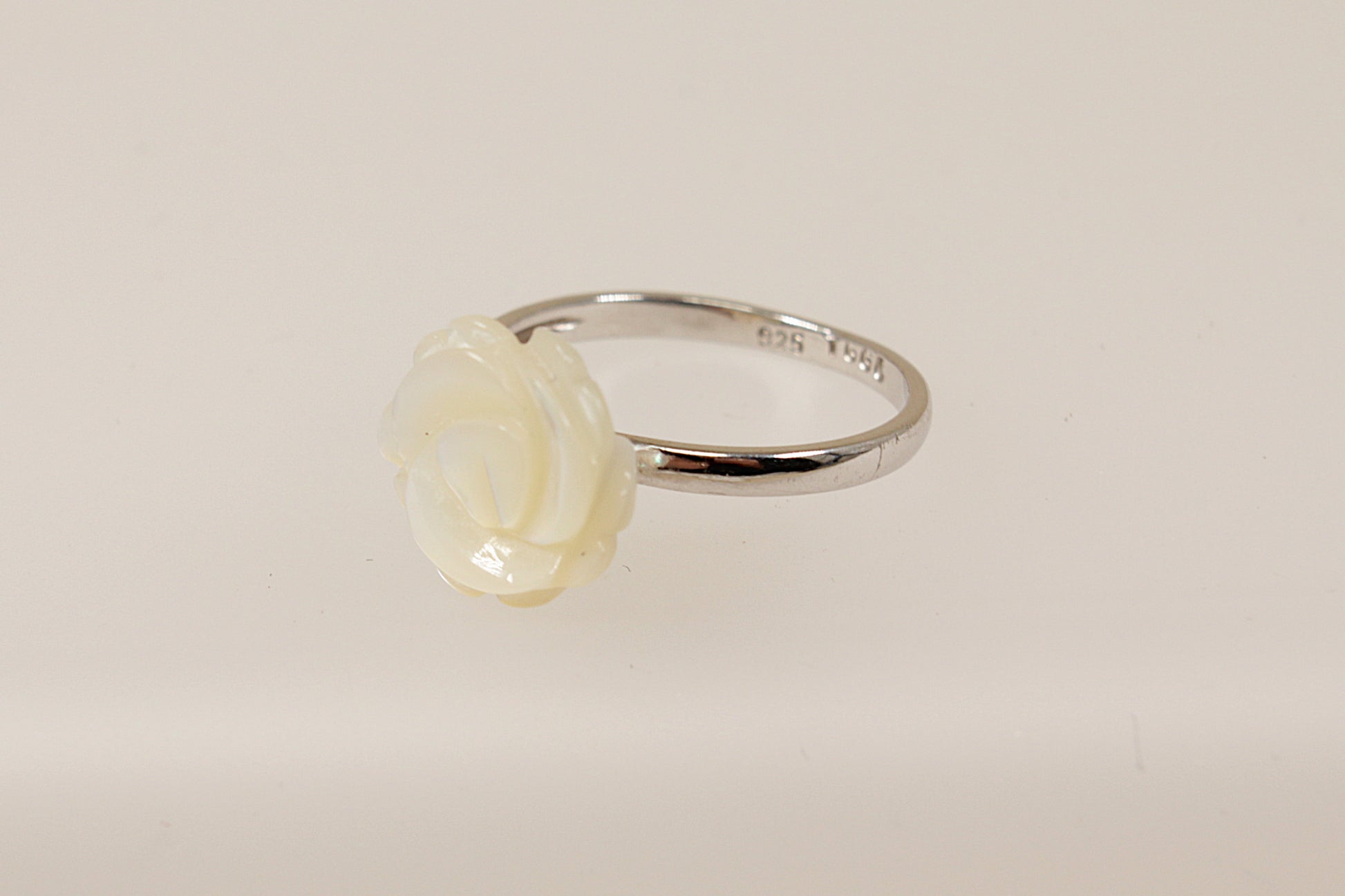 This enchanting and delicate Silver ring has a carved white Mother of Pearl looking rose in full bloom!