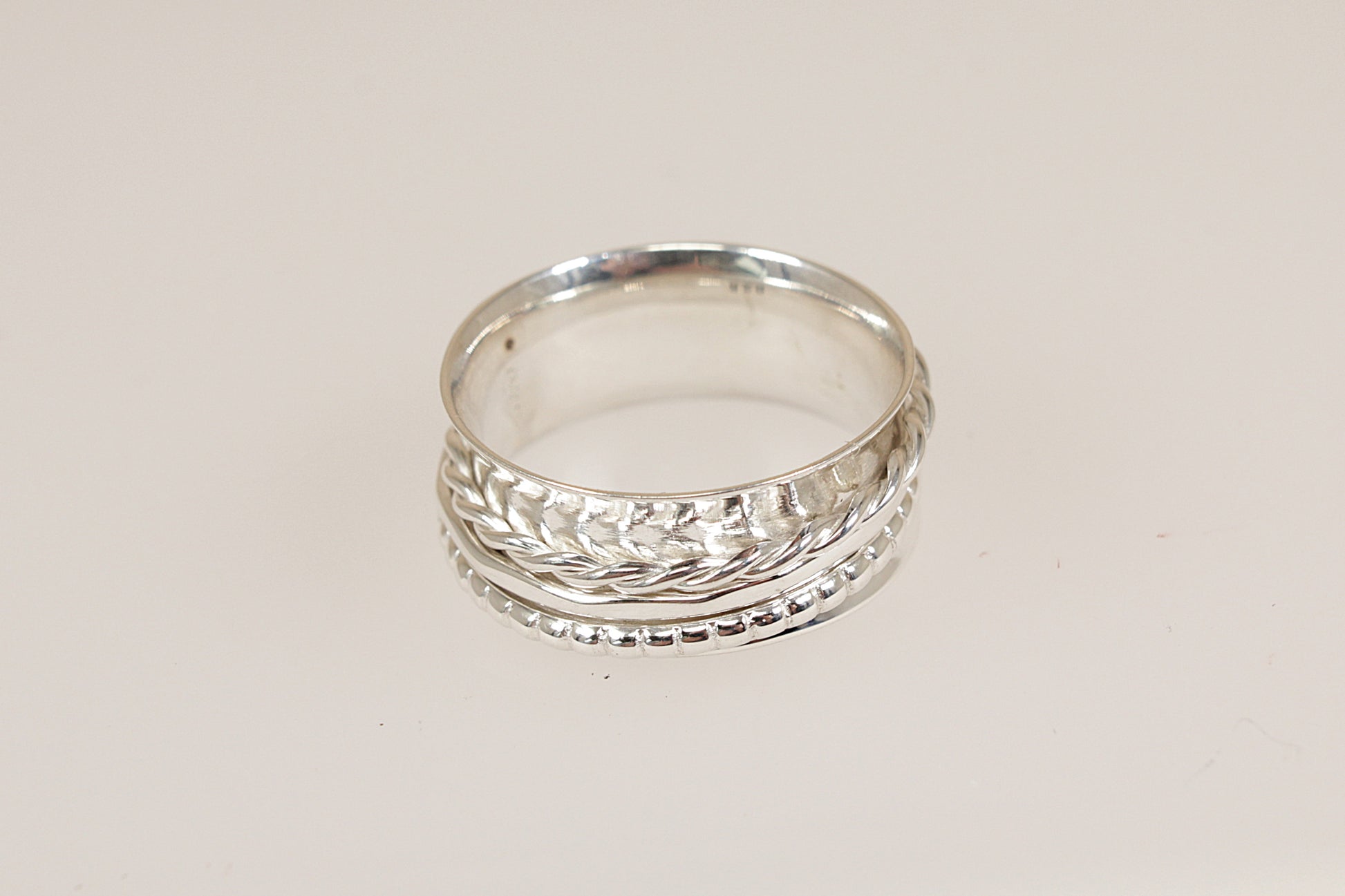 A stylish Silver spinner ring featuring intricate detailing and two finely crafted inner spinning bands.
