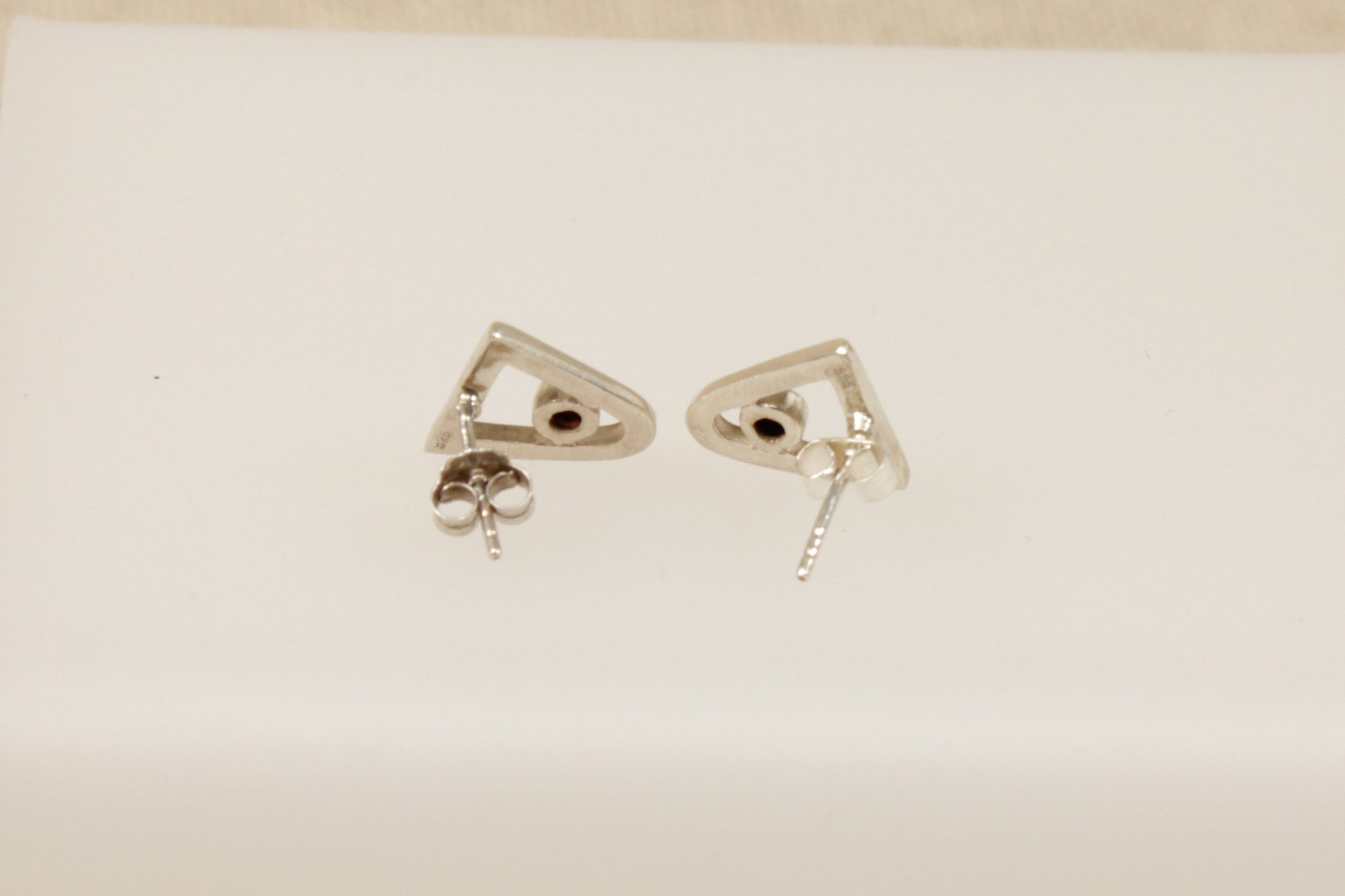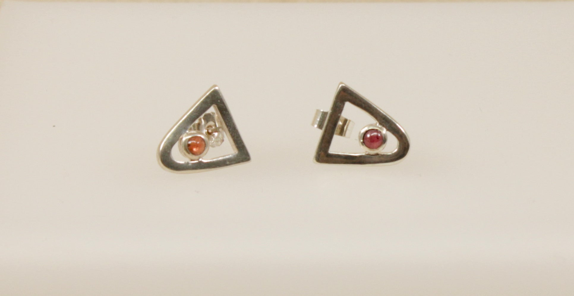 These pretty ear Silver Stud Earrings have a round cabochon Amethyst set into a triangular shaped silver setting.