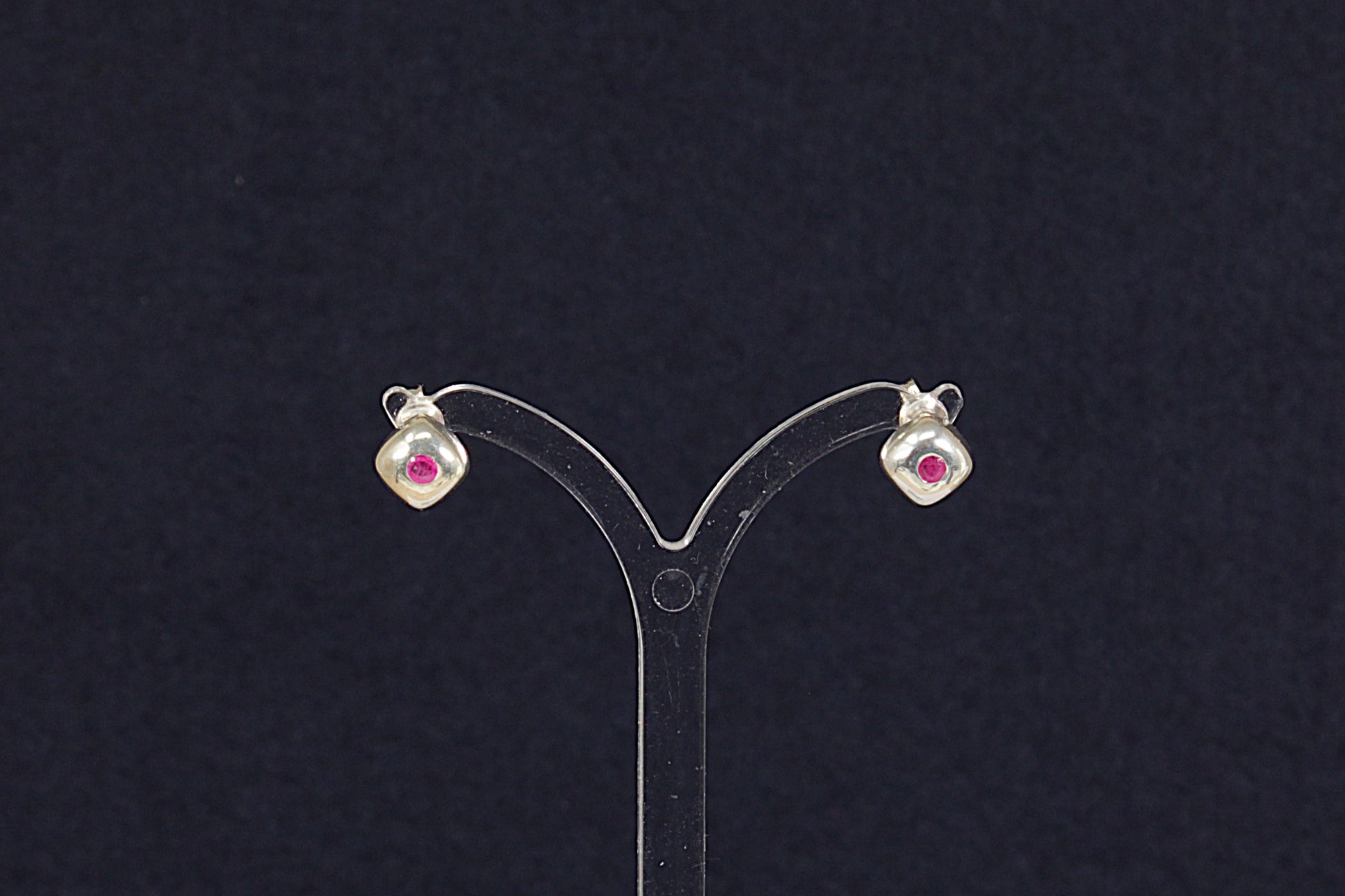 This charming pair of Silver Kit Heath designer stud earrings features a modern square silhouette with gently domed tops, each set with a beautifully faceted round Ruby in a secure bezel setting.