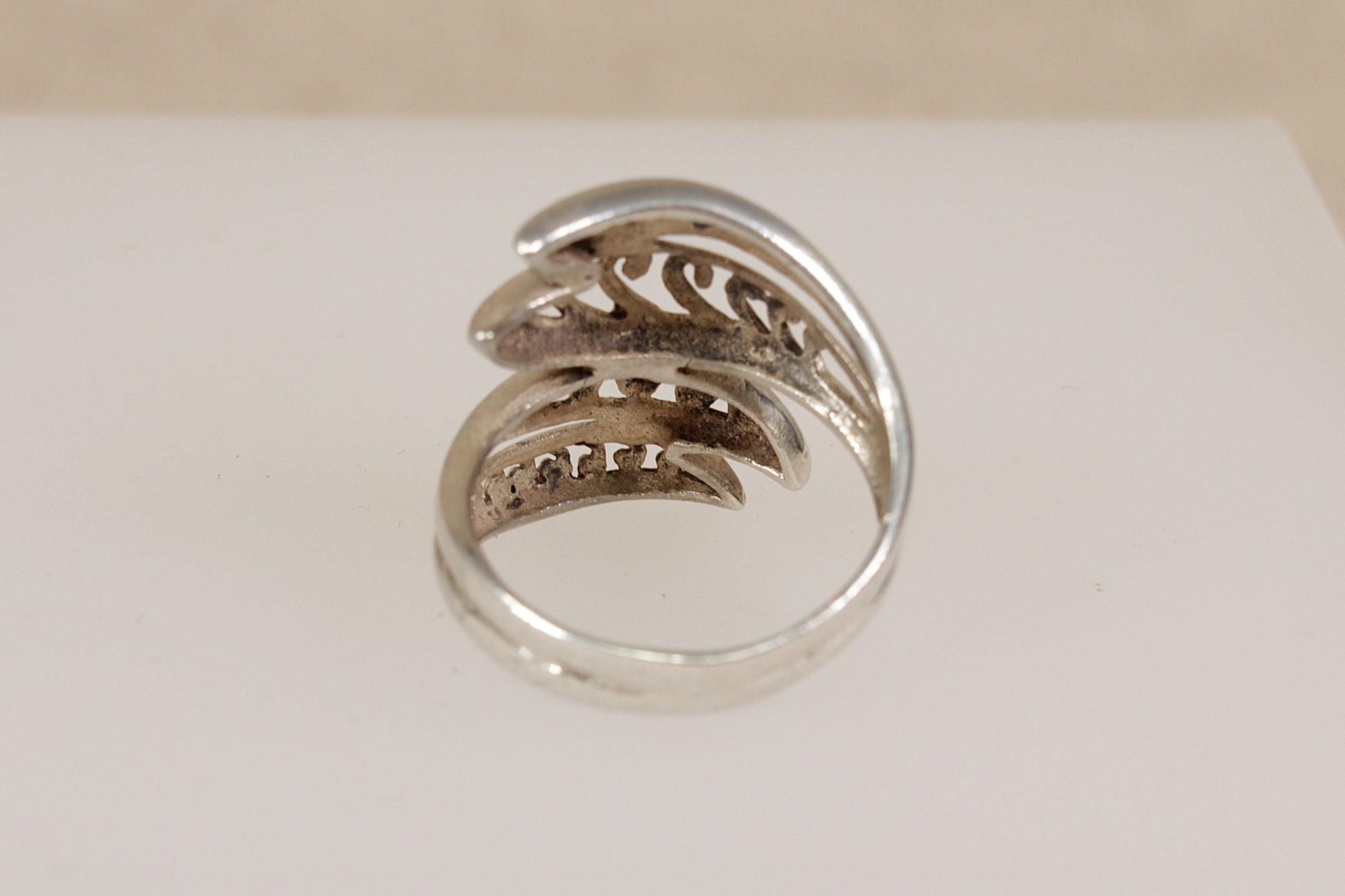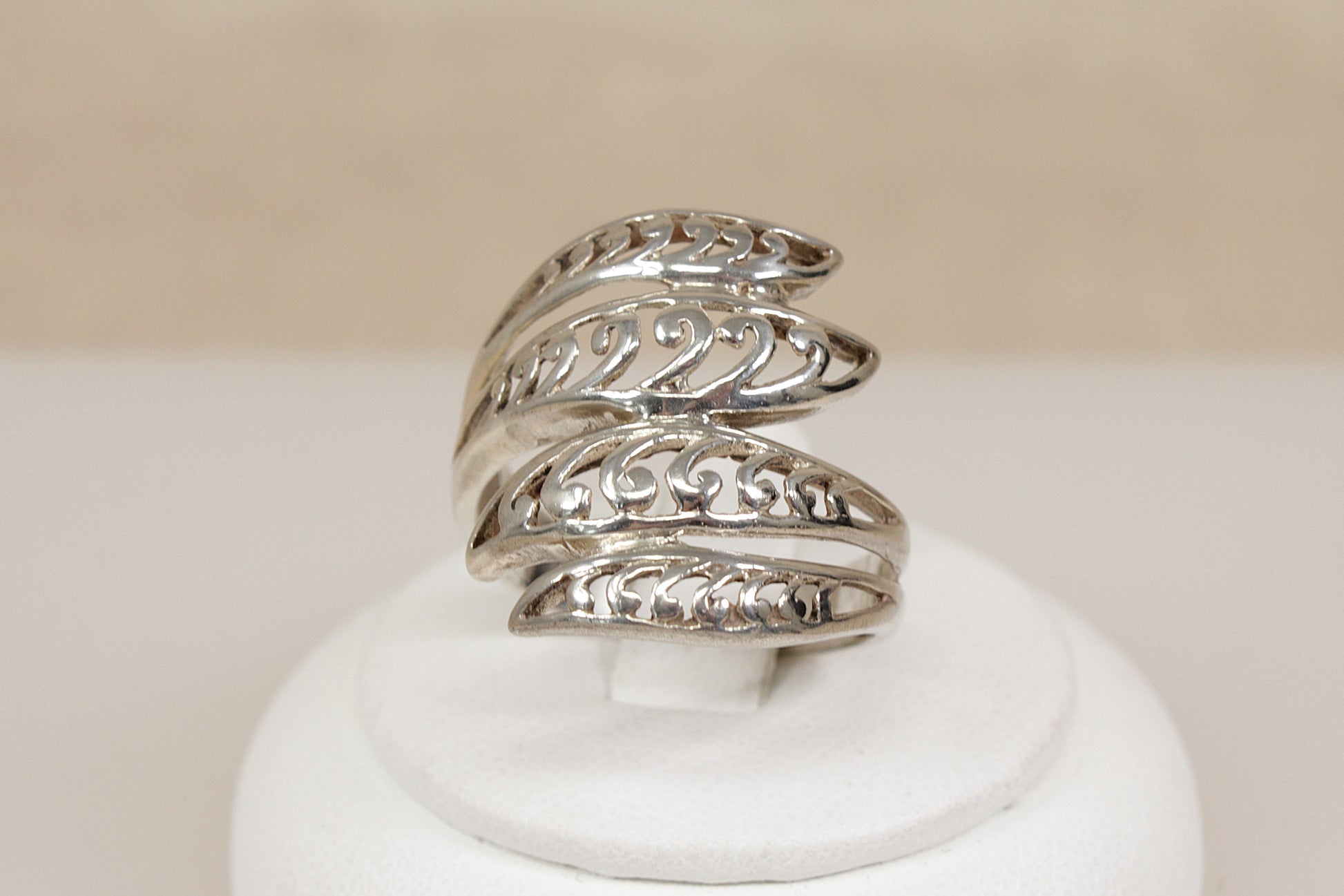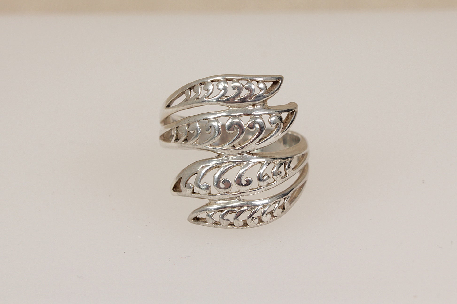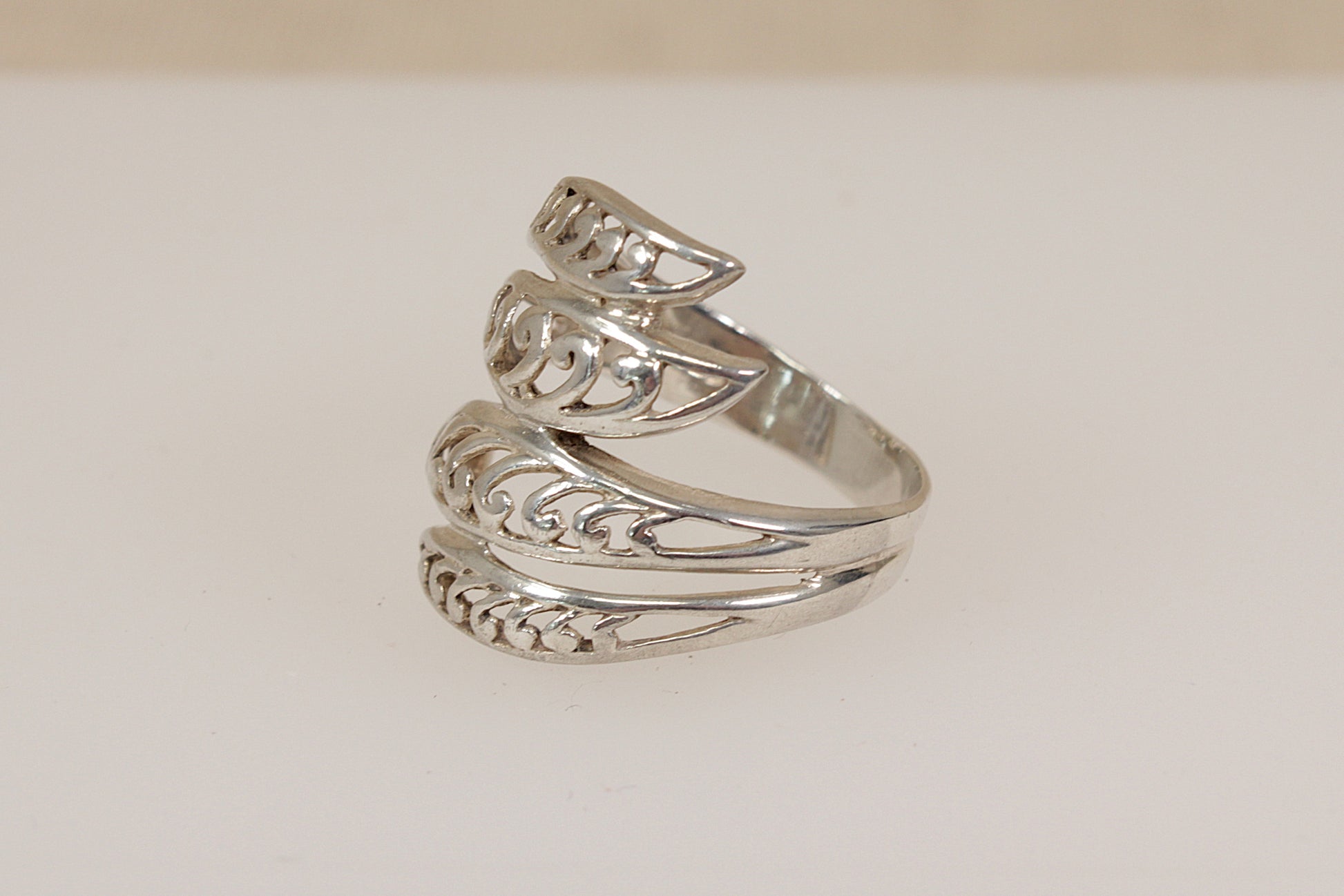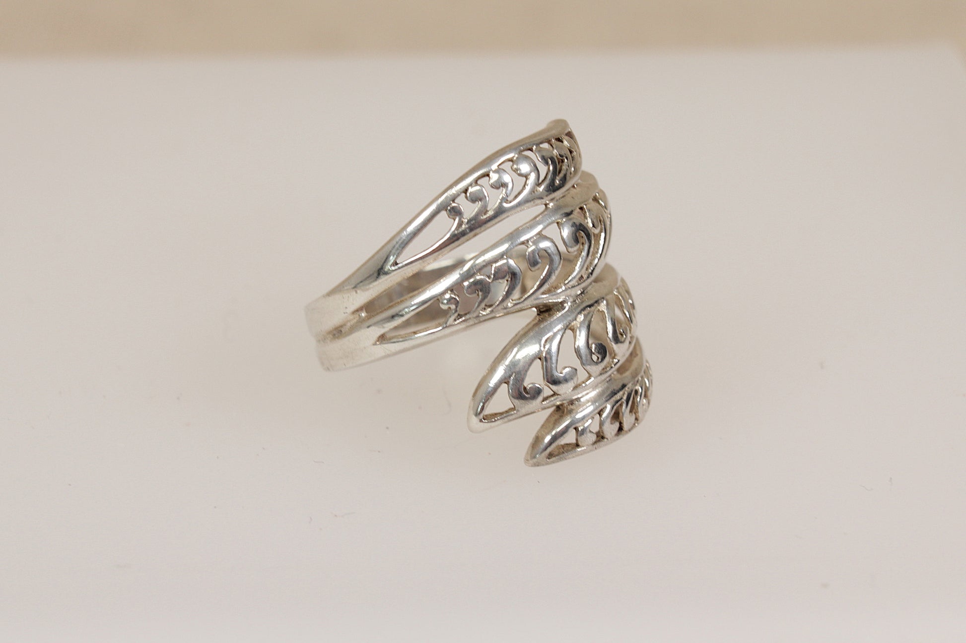 A striking Sterling Silver ring featuring an elegant twisted design, composed of four strands of open silverwork that gracefully intertwine around the finger, slightly elongated in shape.