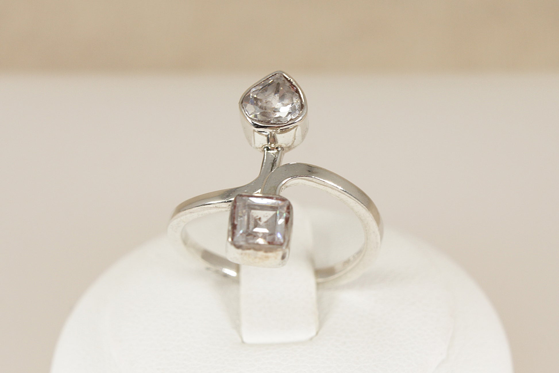 The ring showcases a square bezel-set Crystal paired with a pear-shaped Crystal, creating a striking and contemporary duo.