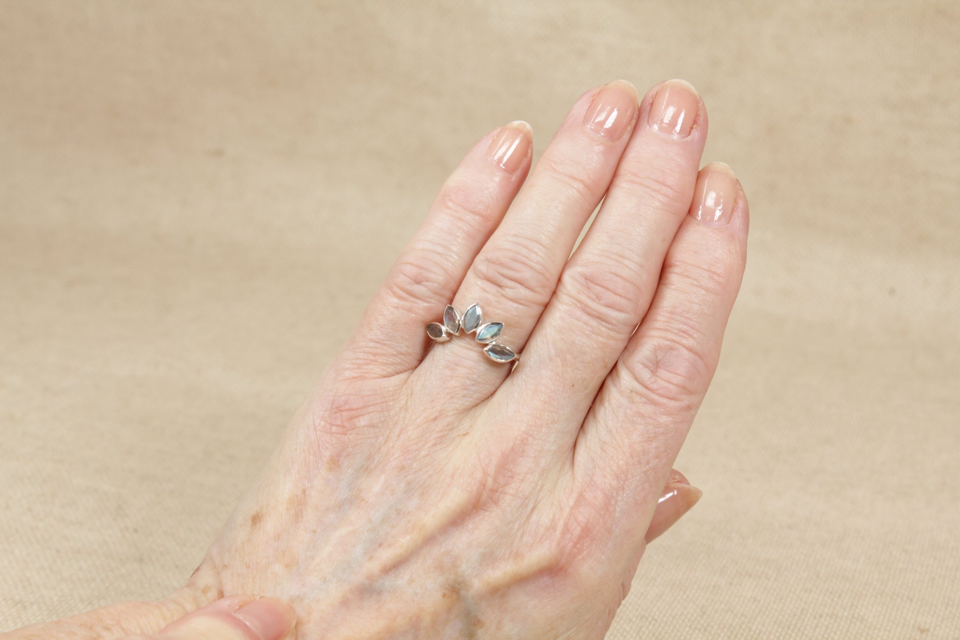 Handcrafted by the designers at POM 925 Jewellery, it has 5 marquis cut Labradorite gemstones, bezel set, that’s arranged in a half-halo flower pattern.