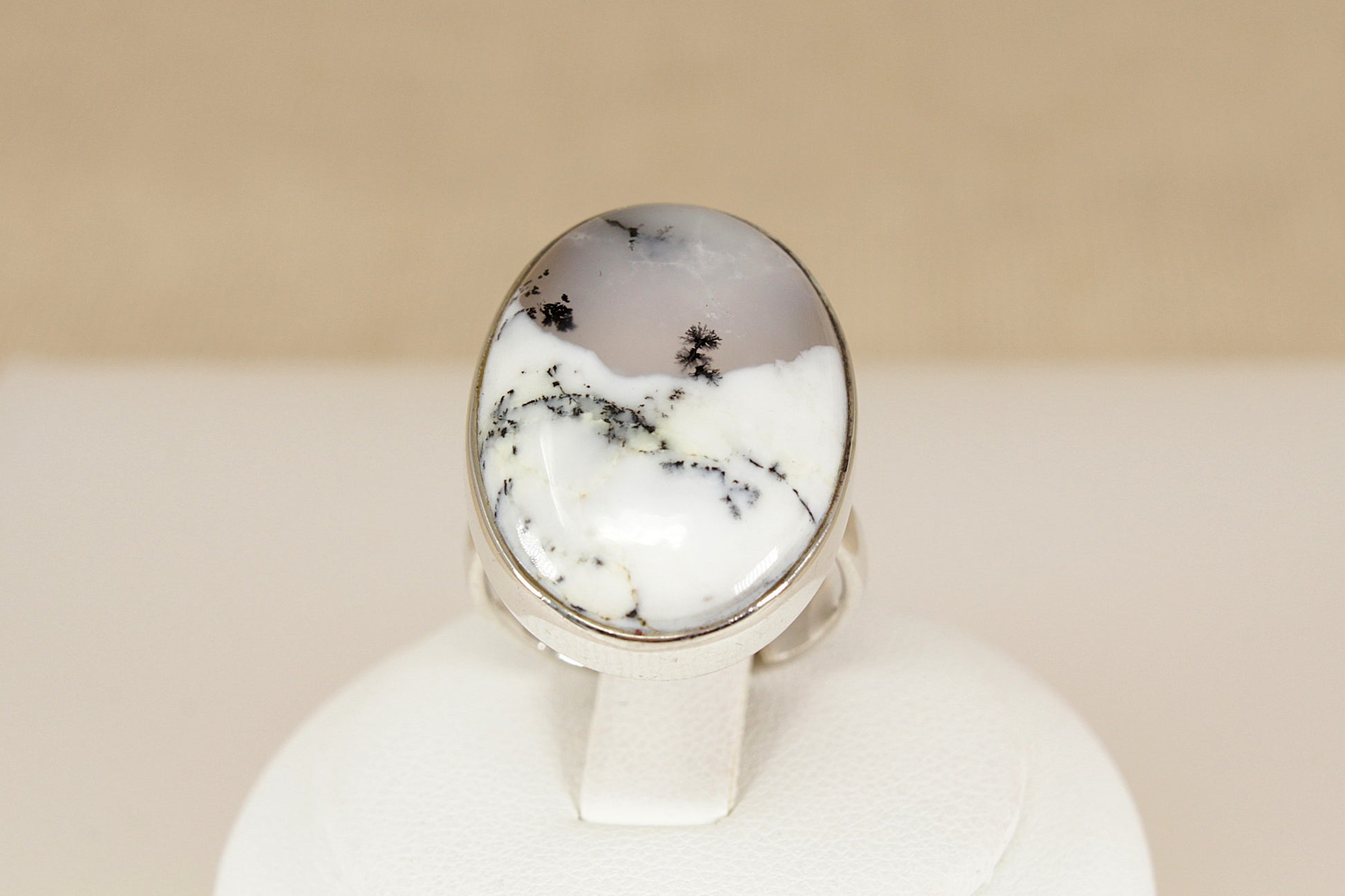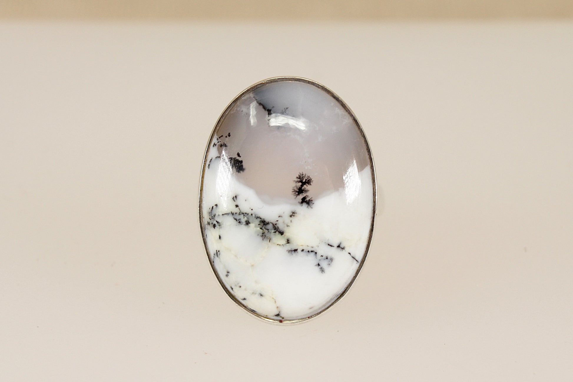 The stone displays soft shades of grey and white with distinctive black fern moss-like inclusions, making each angle unique and full of character.