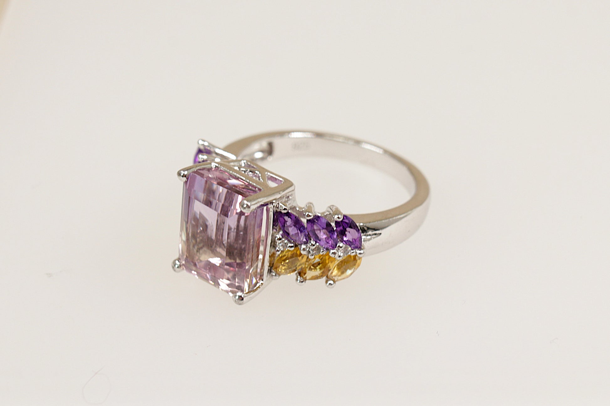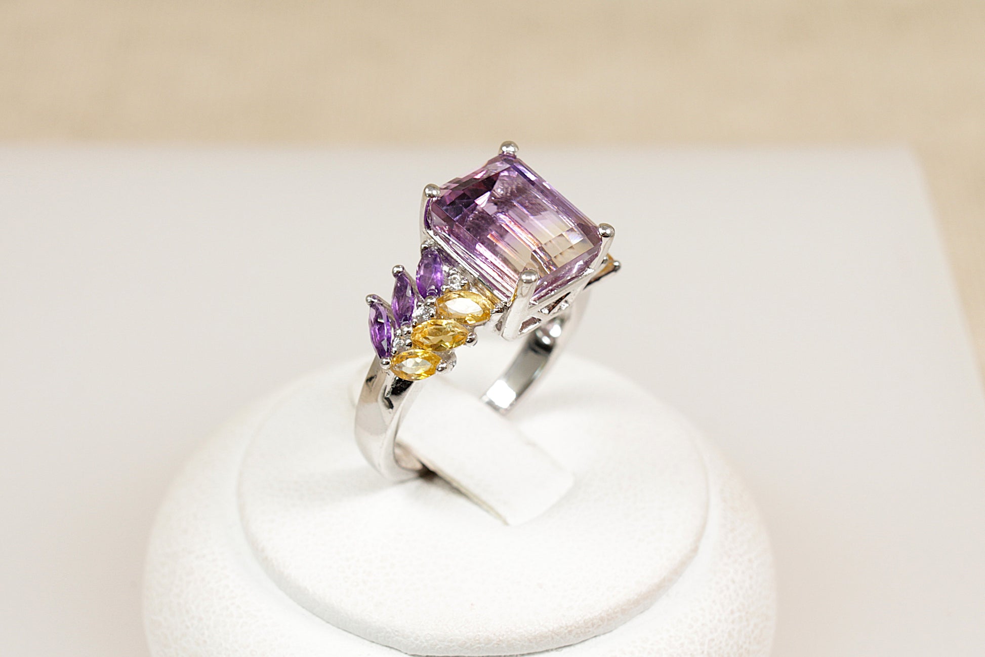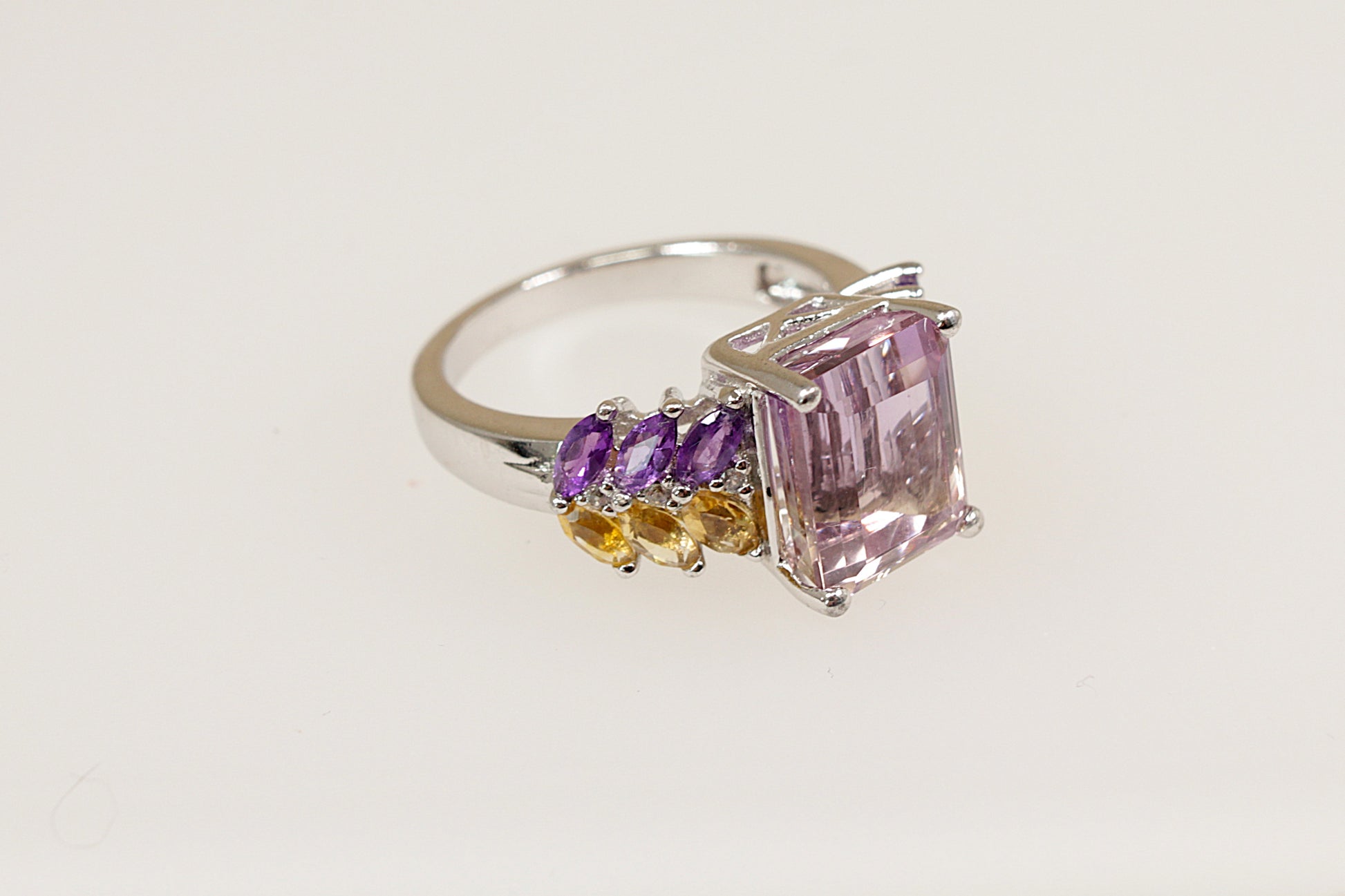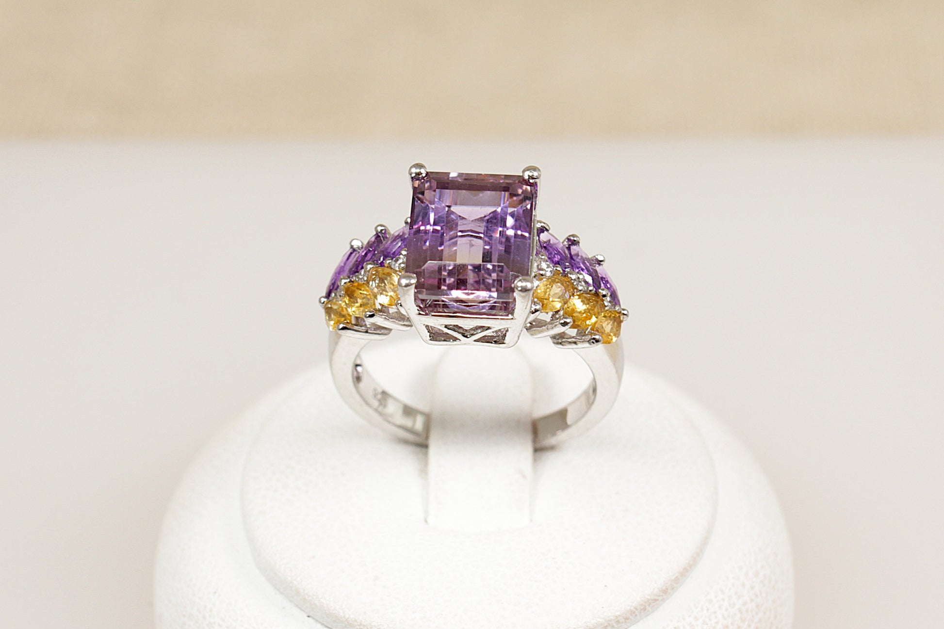 A Silver Amethyst, Citrine and Crystal Statement Ring.