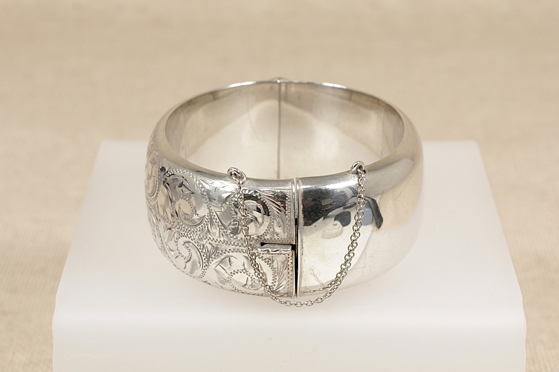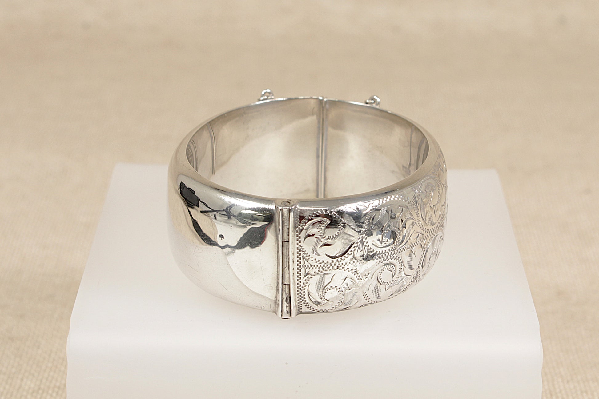 This beautifully crafted Vintage Silver hinged cuff bangle features delicate, floral-inspired etching along half of the band, adding a refined decorative touch.