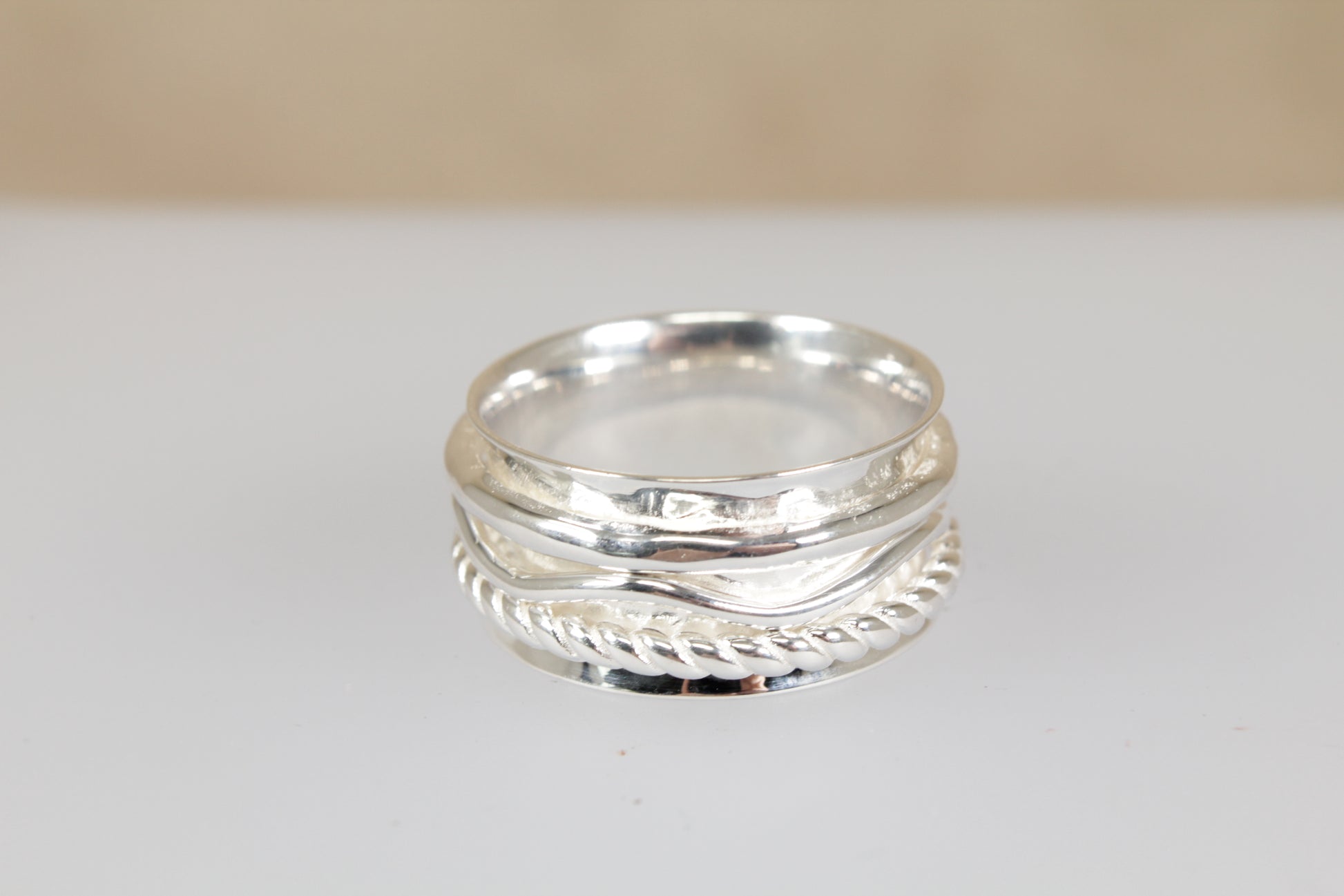 This stylish new Silver spinner ring features a broad, slightly curved hammered band, giving it a bold and contemporary look with lovely texture.