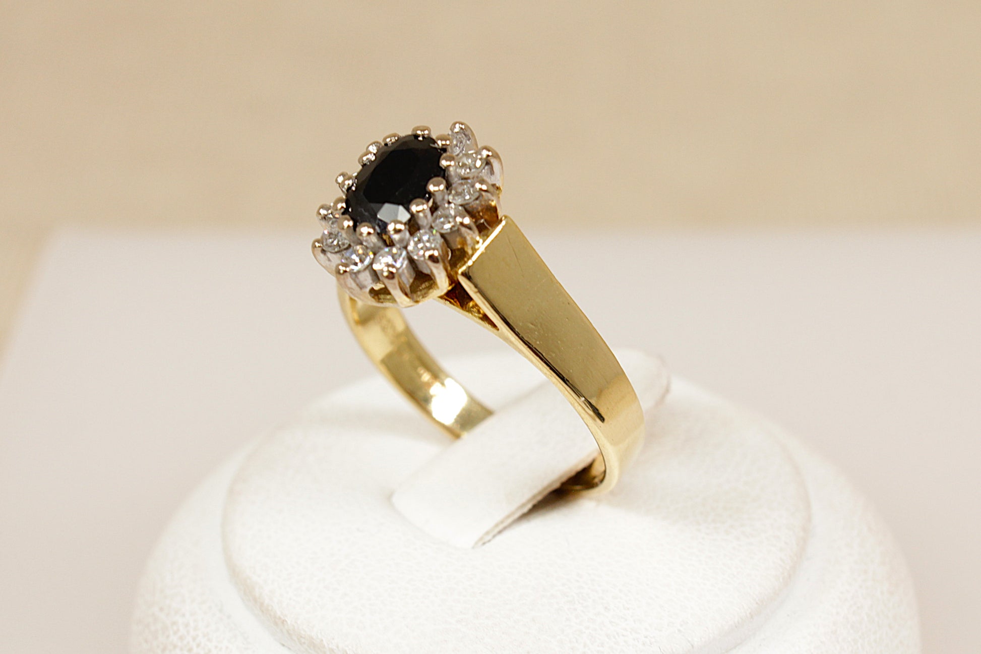 At its centre sits a midnight blue oval Sapphire securely claw set within a raised basket mount. Surrounding the sapphire is a halo of 12 sparkling diamonds, each delicately claw set to enhance the brilliance of the central gem. Inside the band are Birmingham hallmarks for 1976 along with the maker’s mark S & D, confirming its fine craftsmanship and vintage heritage.