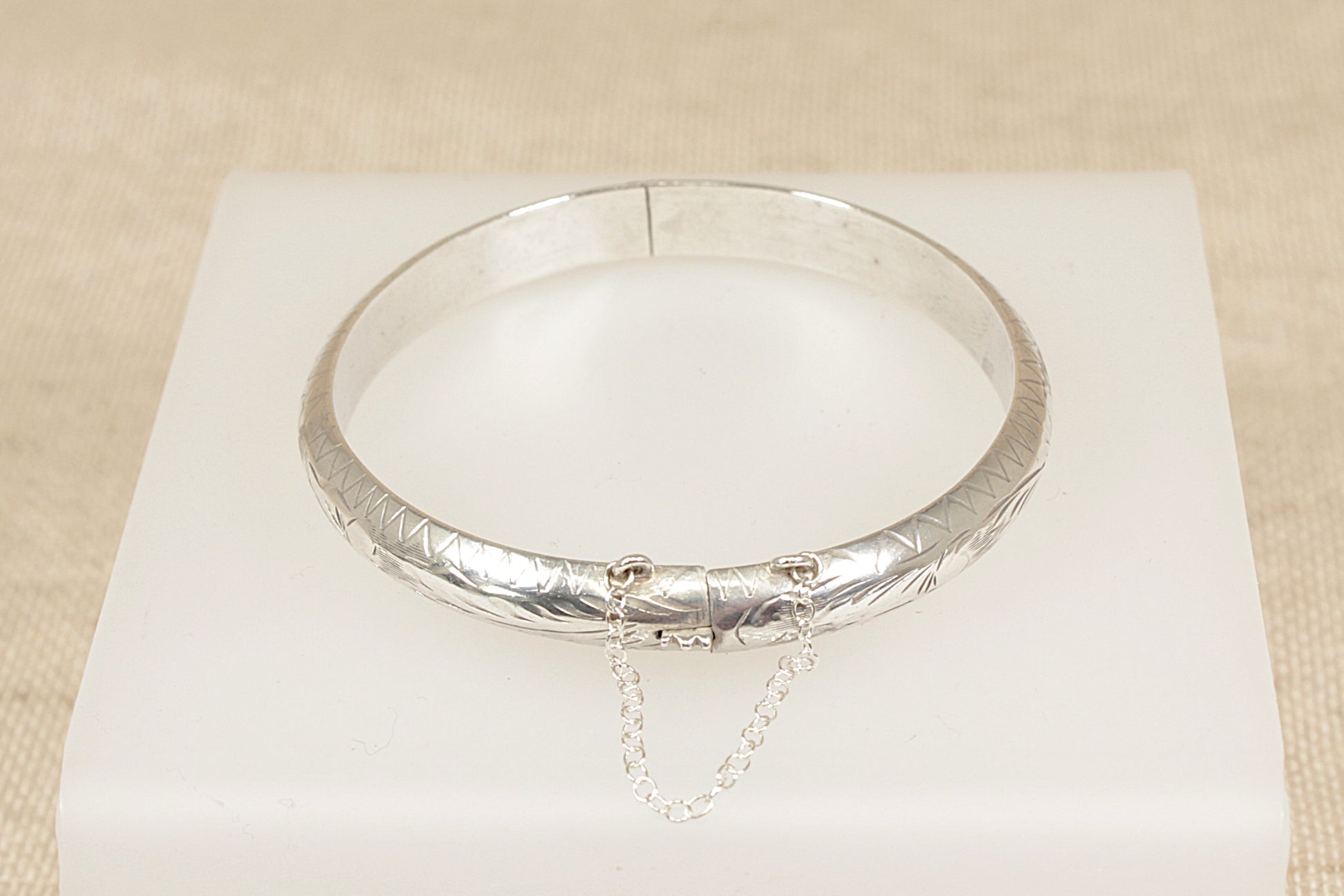 This pretty Vintage Silver hinged bangle features an attractive combination of floral and geometric etched designs that decorate the entire band, giving it a beautifully detailed and timeless look.