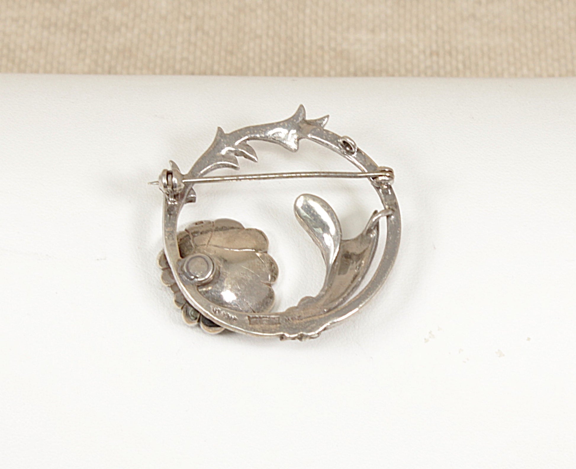 A striking vintage Sterling Silver brooch with a bold circular design, beautifully crafted in an Art Nouveau style. The piece features ornate vine leaves framing the circle, while the interior is adorned with a lily-shaped flower and a large flower head, both richly encrusted with sparkling Marcasite stones for a glamorous finish.