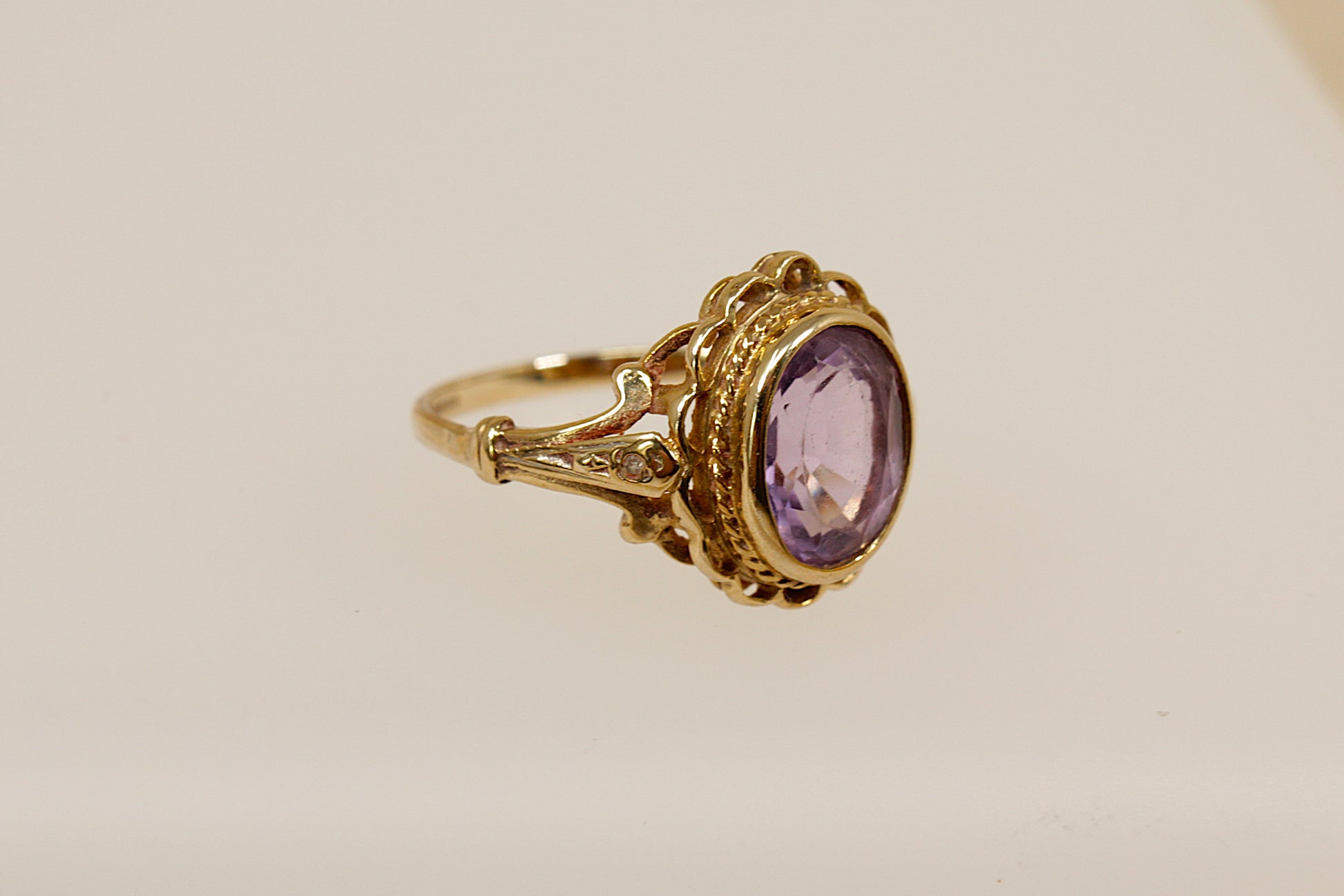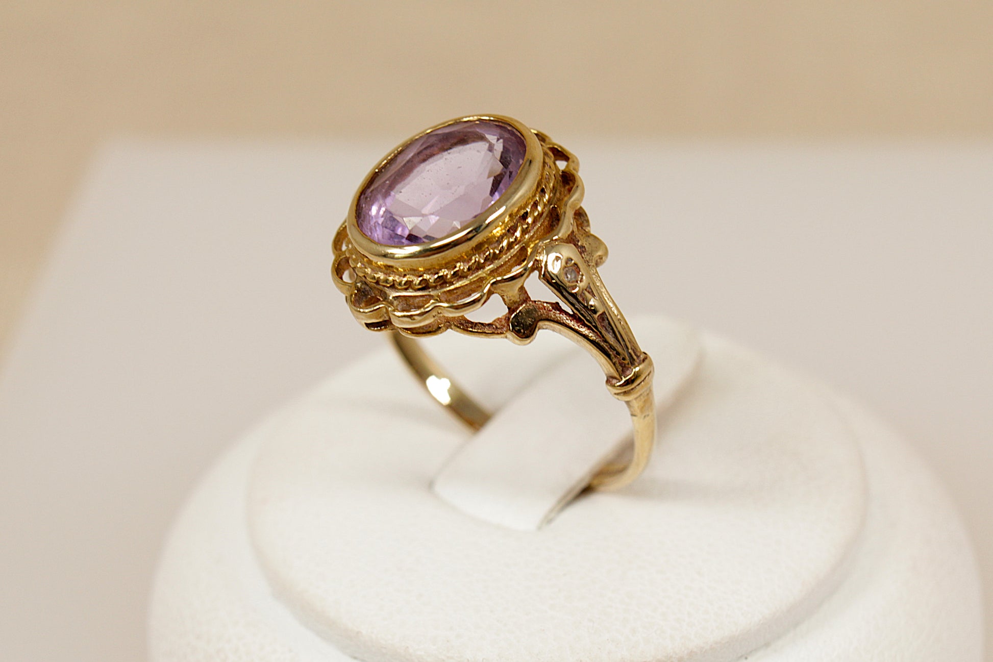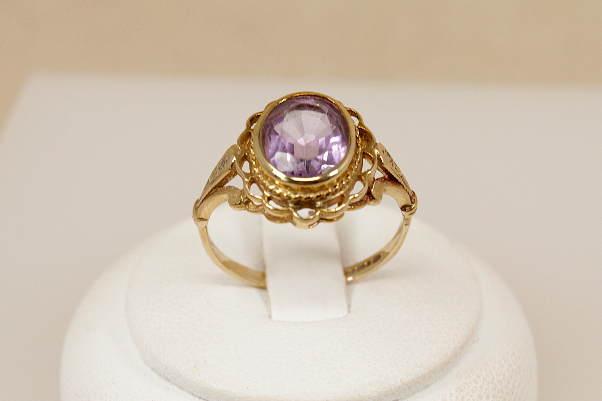 This lovely vintage Amethyst ring is in excellent condition, it has an oval Amethyst set in 9ct Gold with lovely scrolling around the stone.