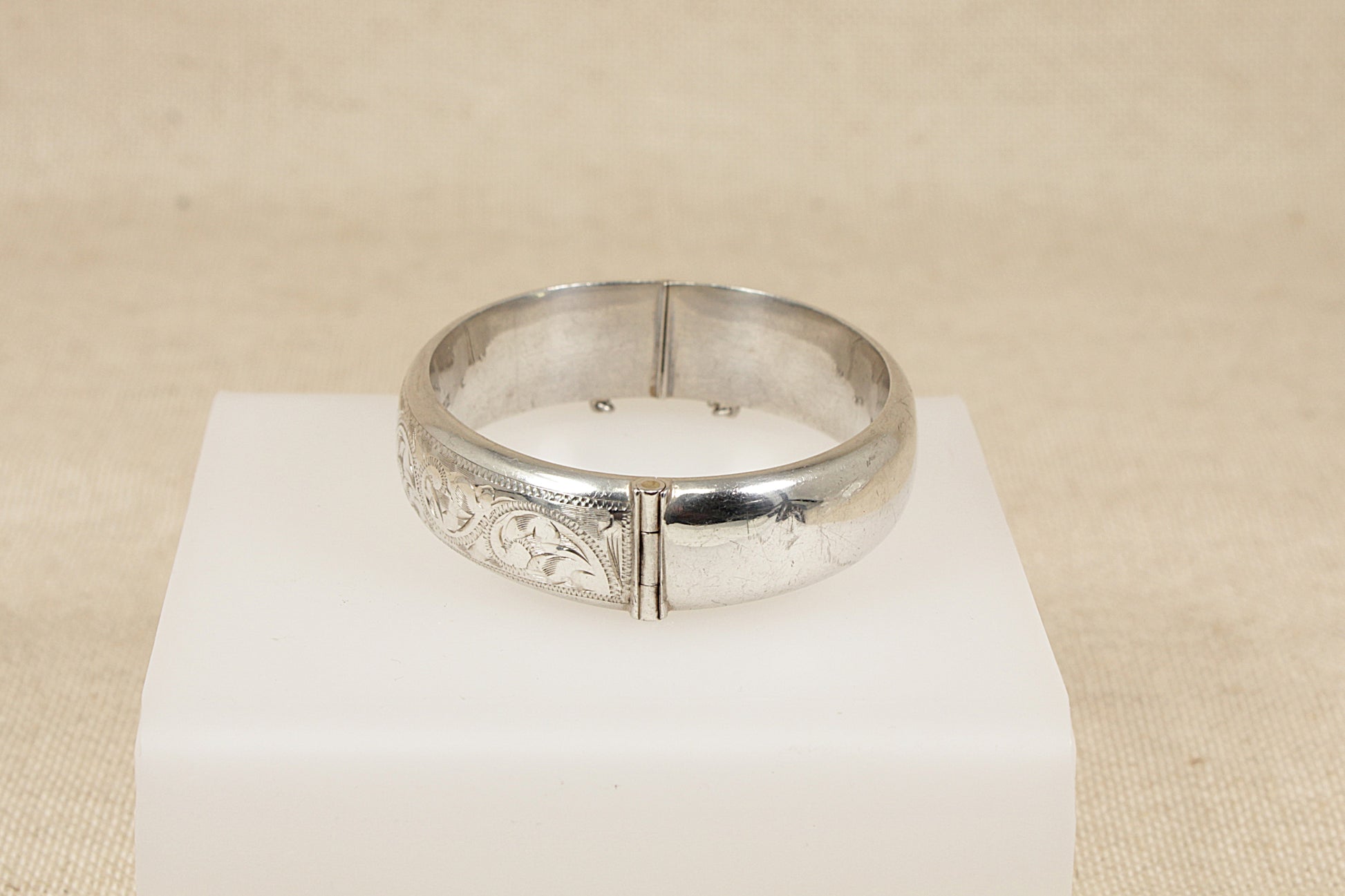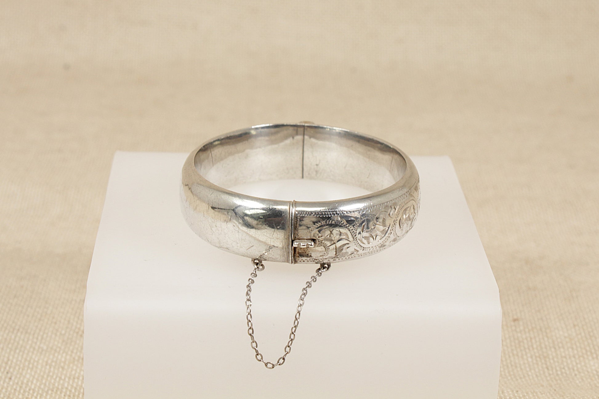 A charming vintage Sterling Silver hinged bangle, finely detailed with floral etching across half the circumference, while the reverse is left smooth for contrast. The bangle is broad and sturdy, fitted with a secure hinge and safety chain for peace of mind when worn.