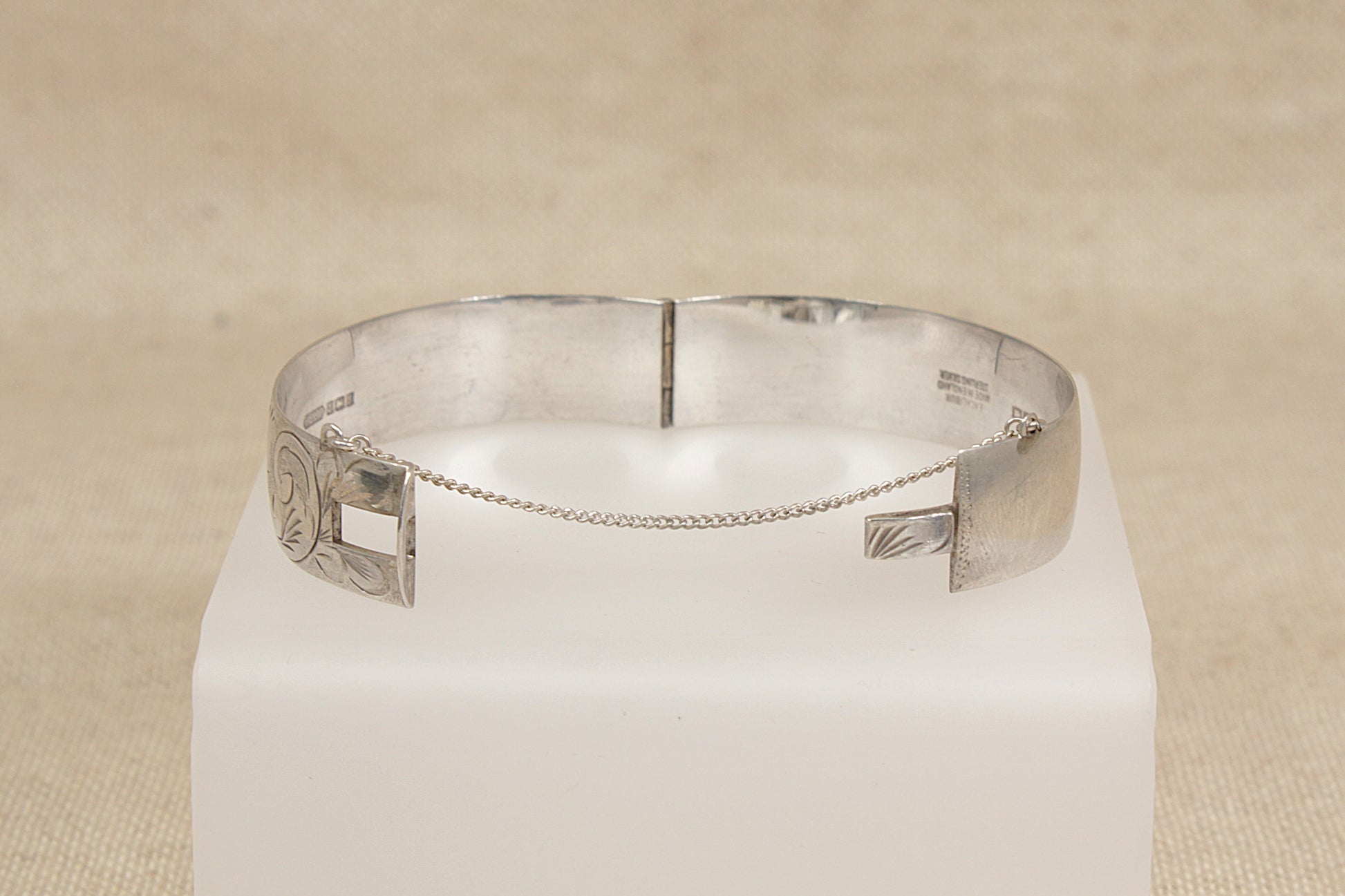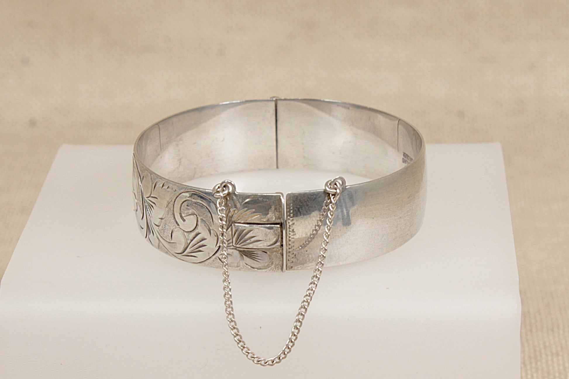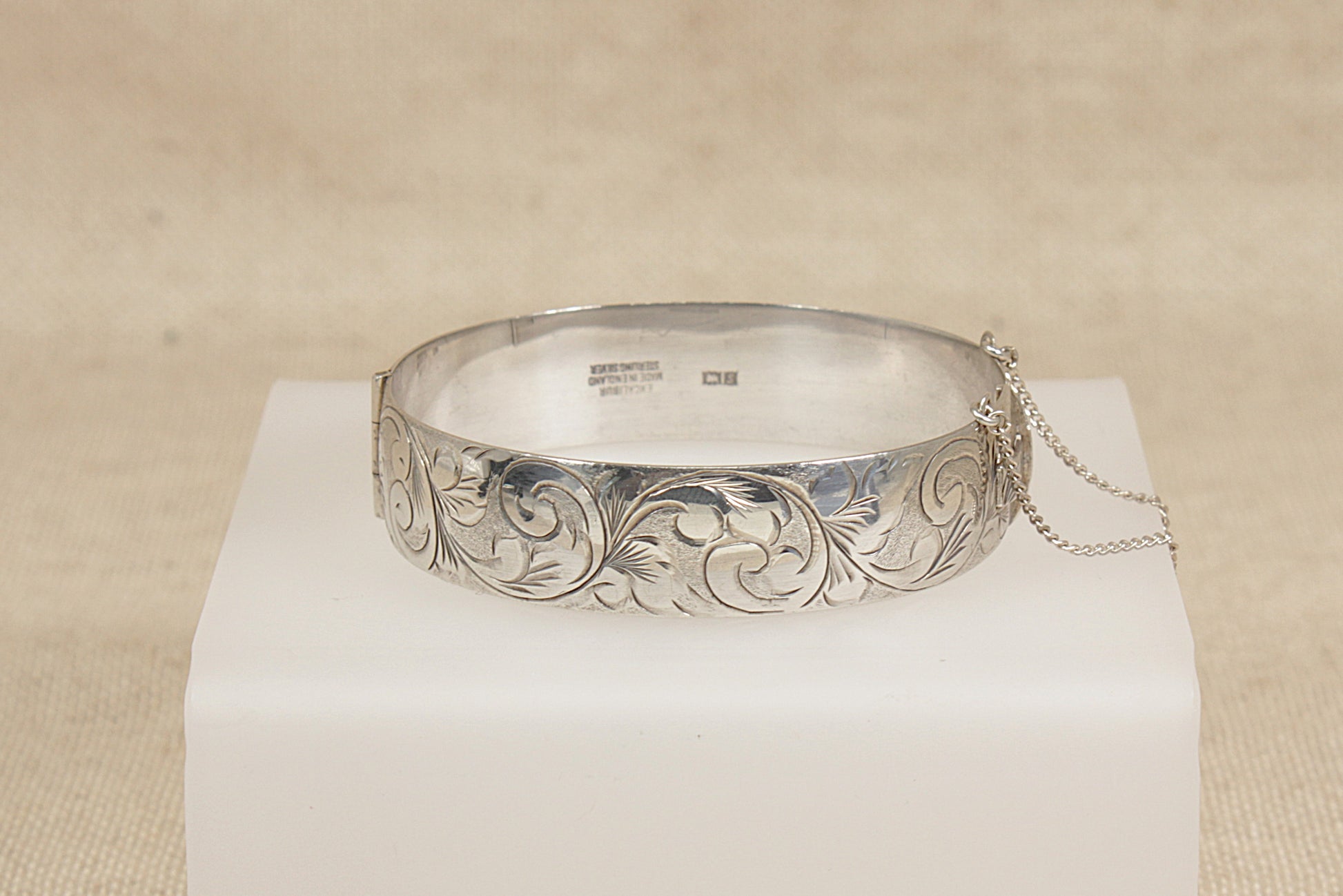 This beautiful vintage solid Silver hinged bangle showcases elegant floral-inspired etchings across half of the band, reflecting classic mid-century craftsmanship. It features a secure hinge and strong clasp with a safety chain for added security.