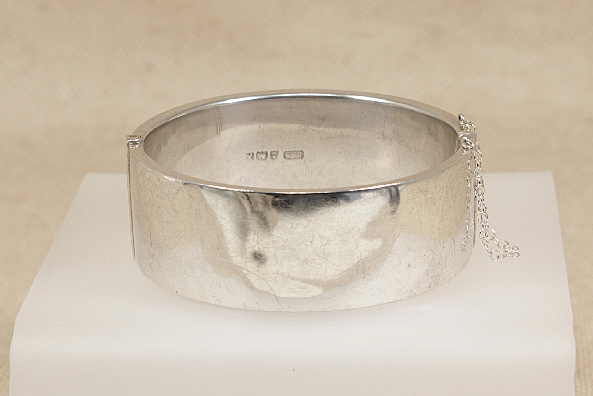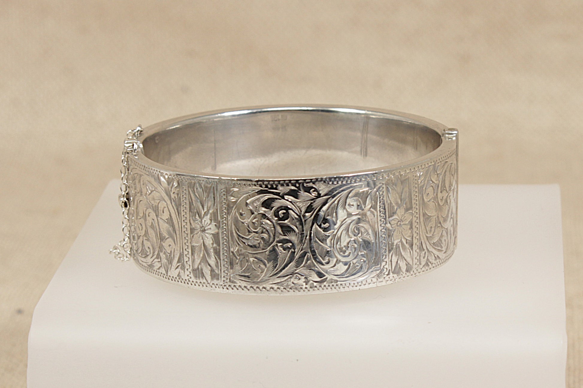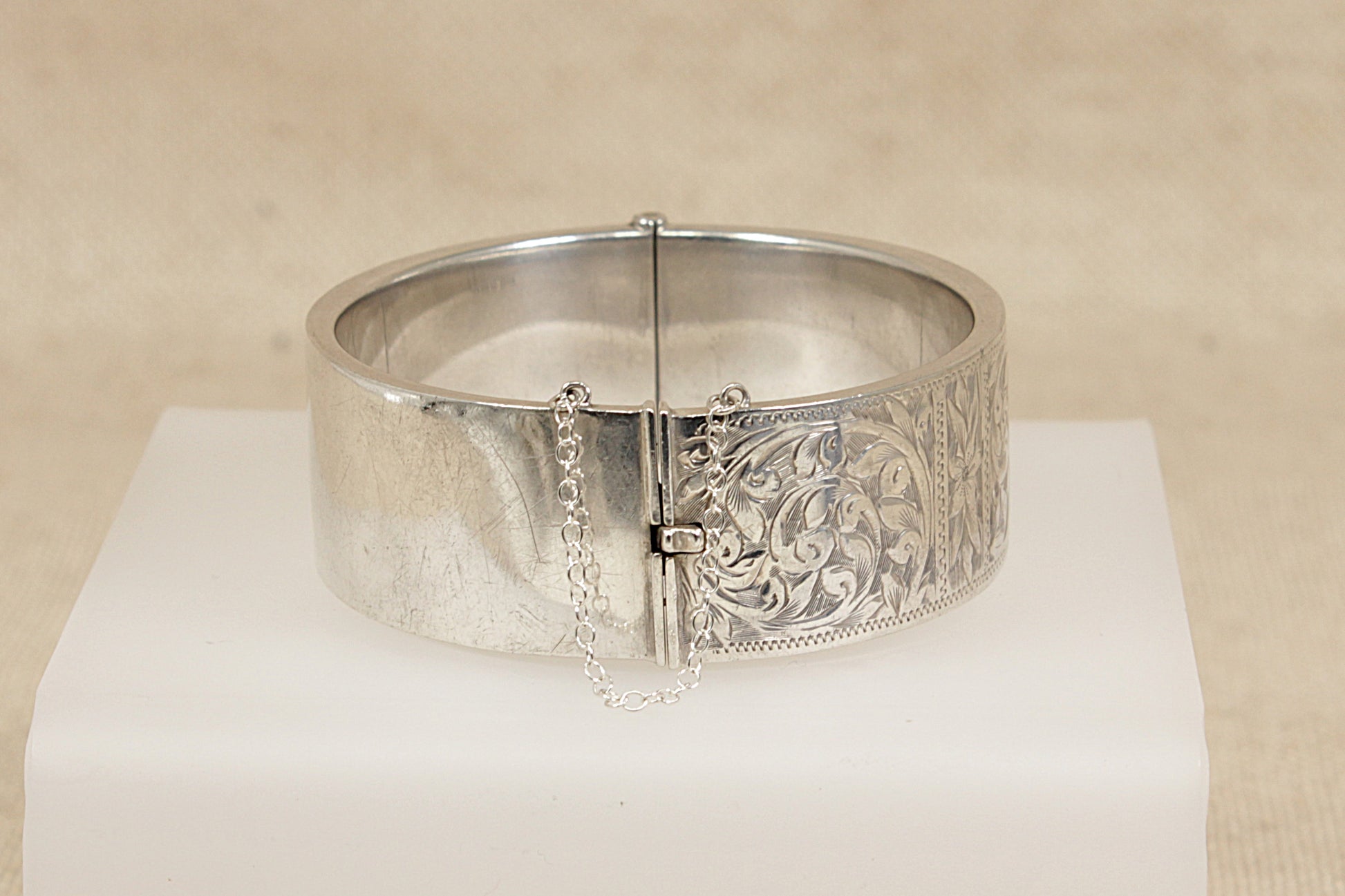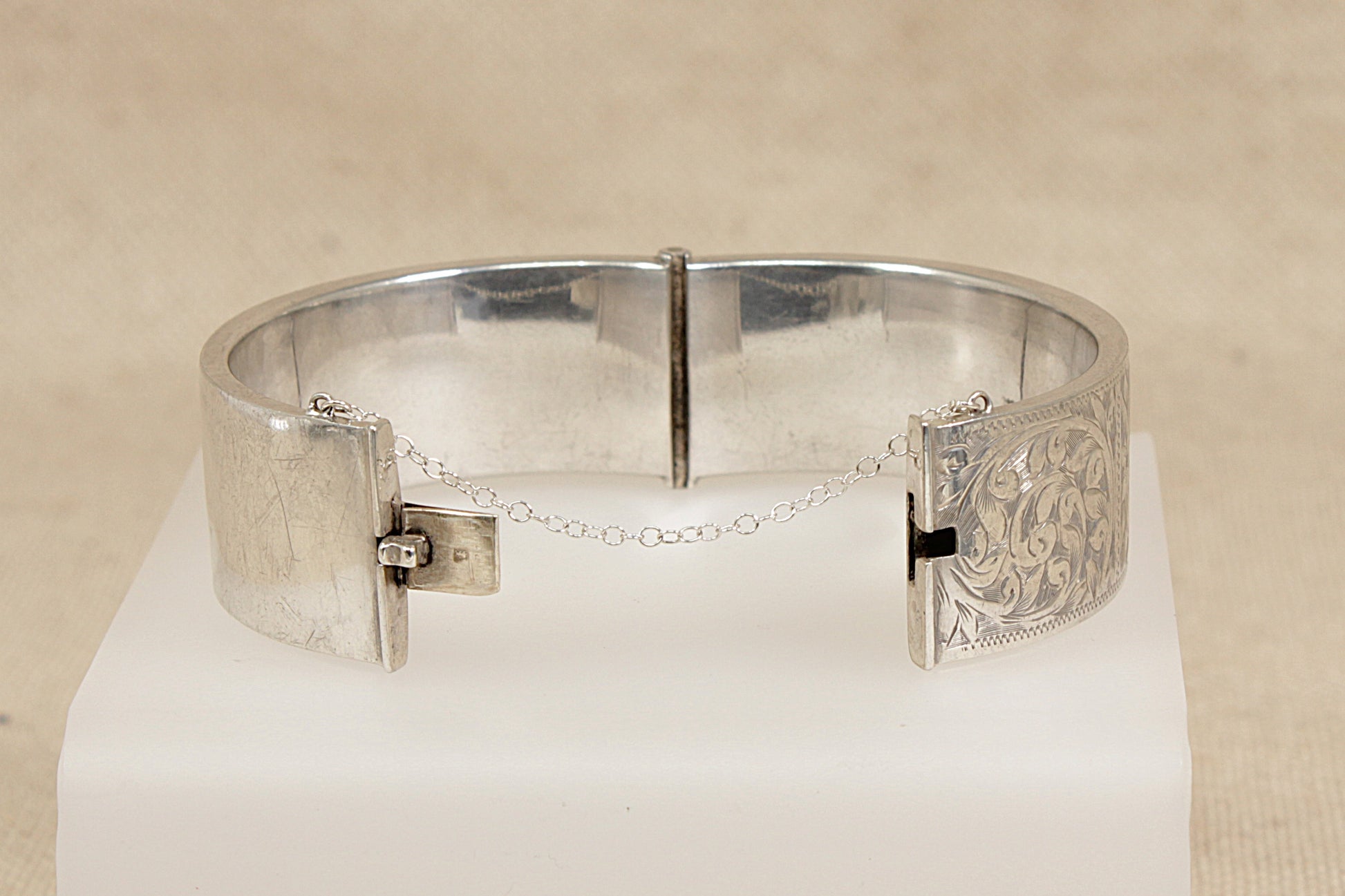 Vintage Silver Hinged Cuff Bangle Bracelet his stunning vintage Silver hinged cuff bangle bracelet showcases timeless craftsmanship and elegant simplicity. The broad design features a secure hinge and clasp with a safety chain for added security.