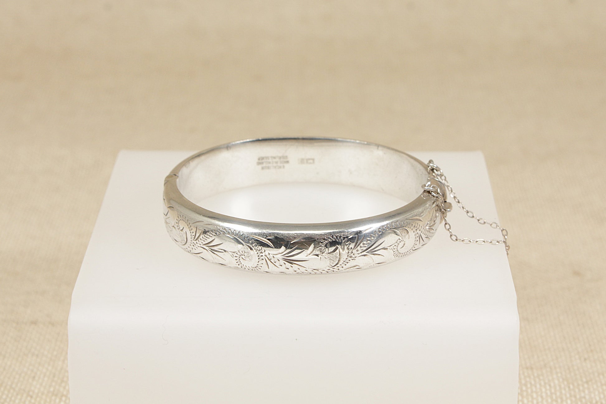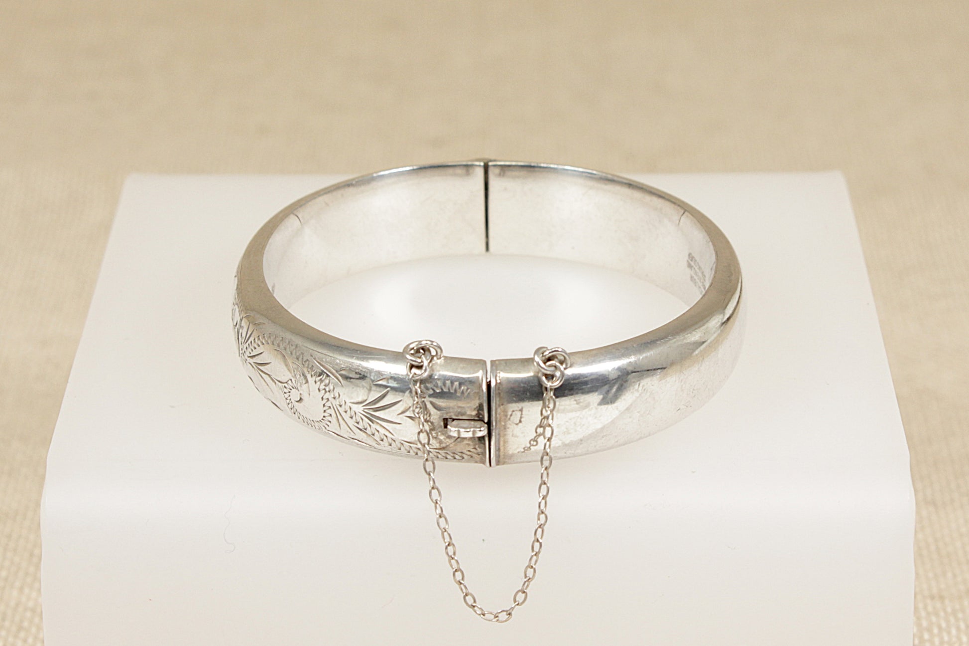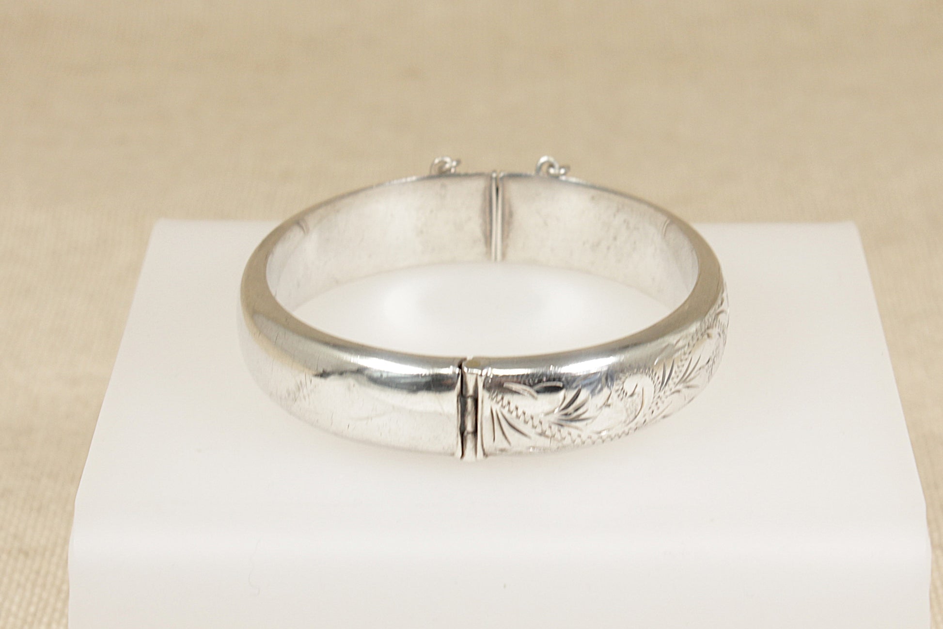 This classic Vintage Silver hinged bangle features floral-inspired etched decoration around half of the band, giving it an elegant and timeless appearance.