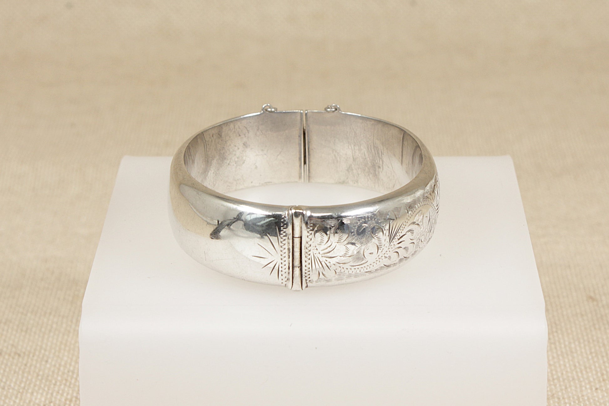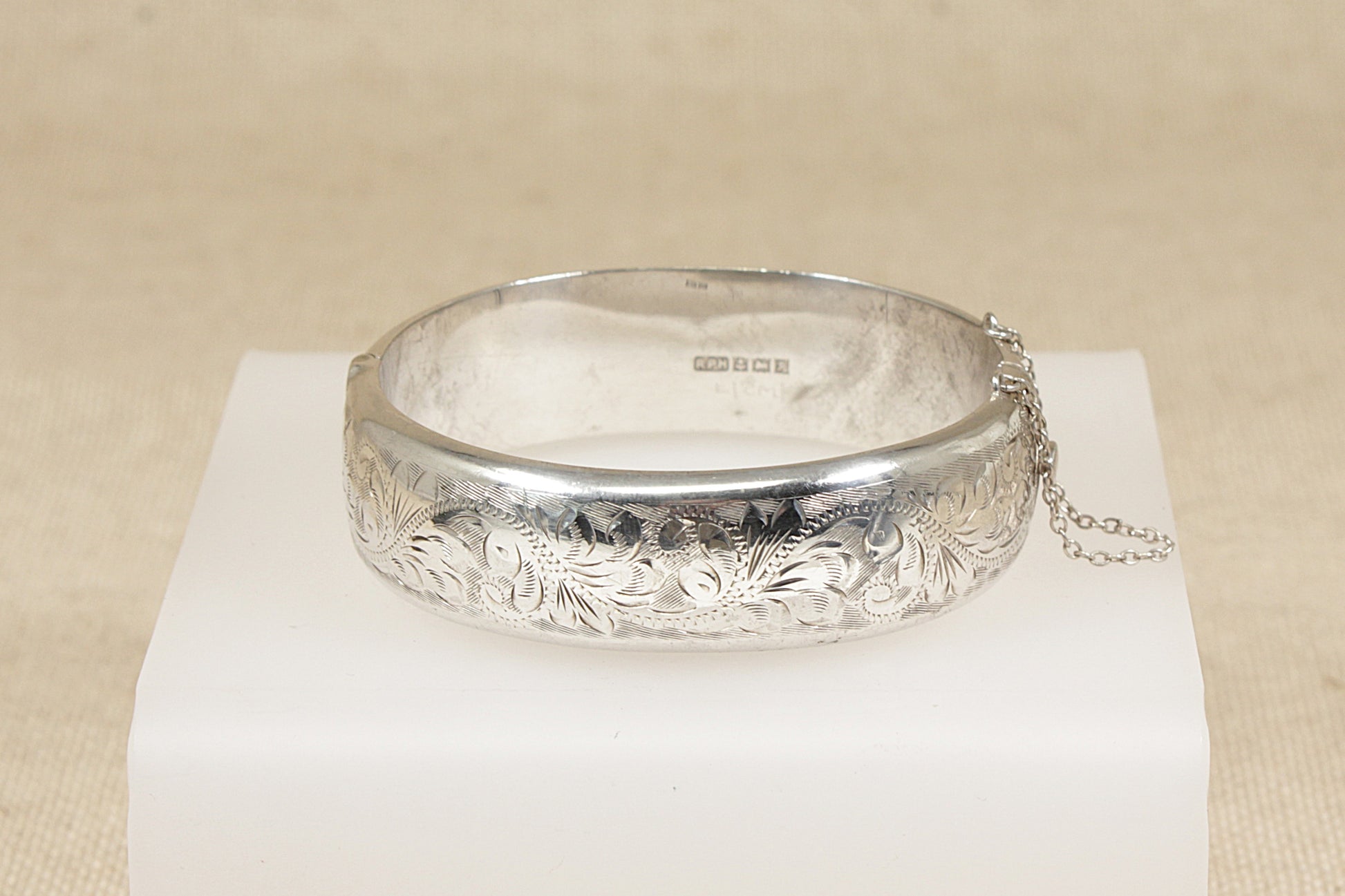 This classic vintage broad Silver hinged bangle is a beautifully crafted piece with floral-inspired etched decoration adorning half of the band, giving it an elegant and timeless character.