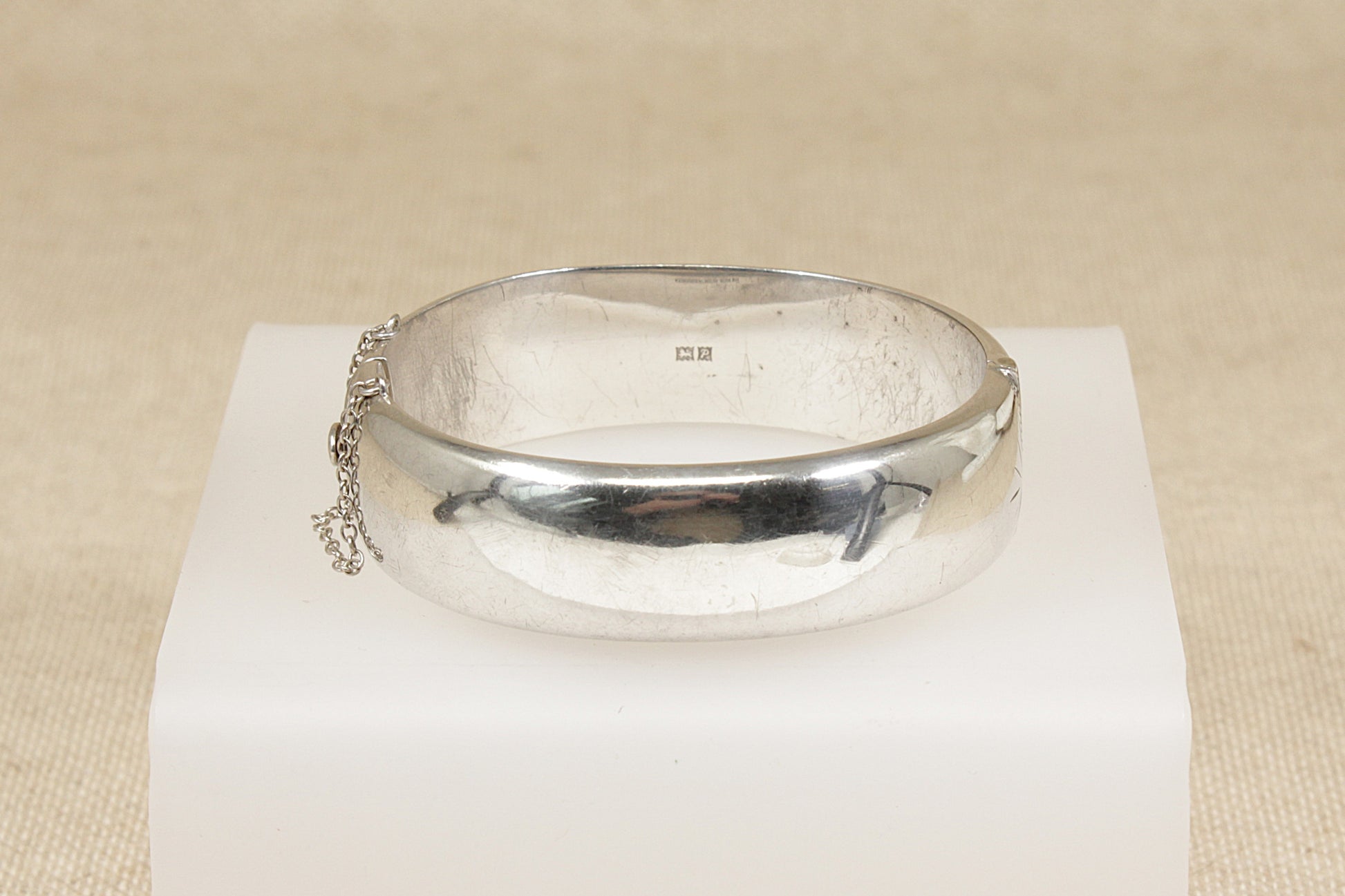 The bangle features a wide silver band, a crisp hinge, and a secure clasp with a safety chain for added security and confidence when worn.