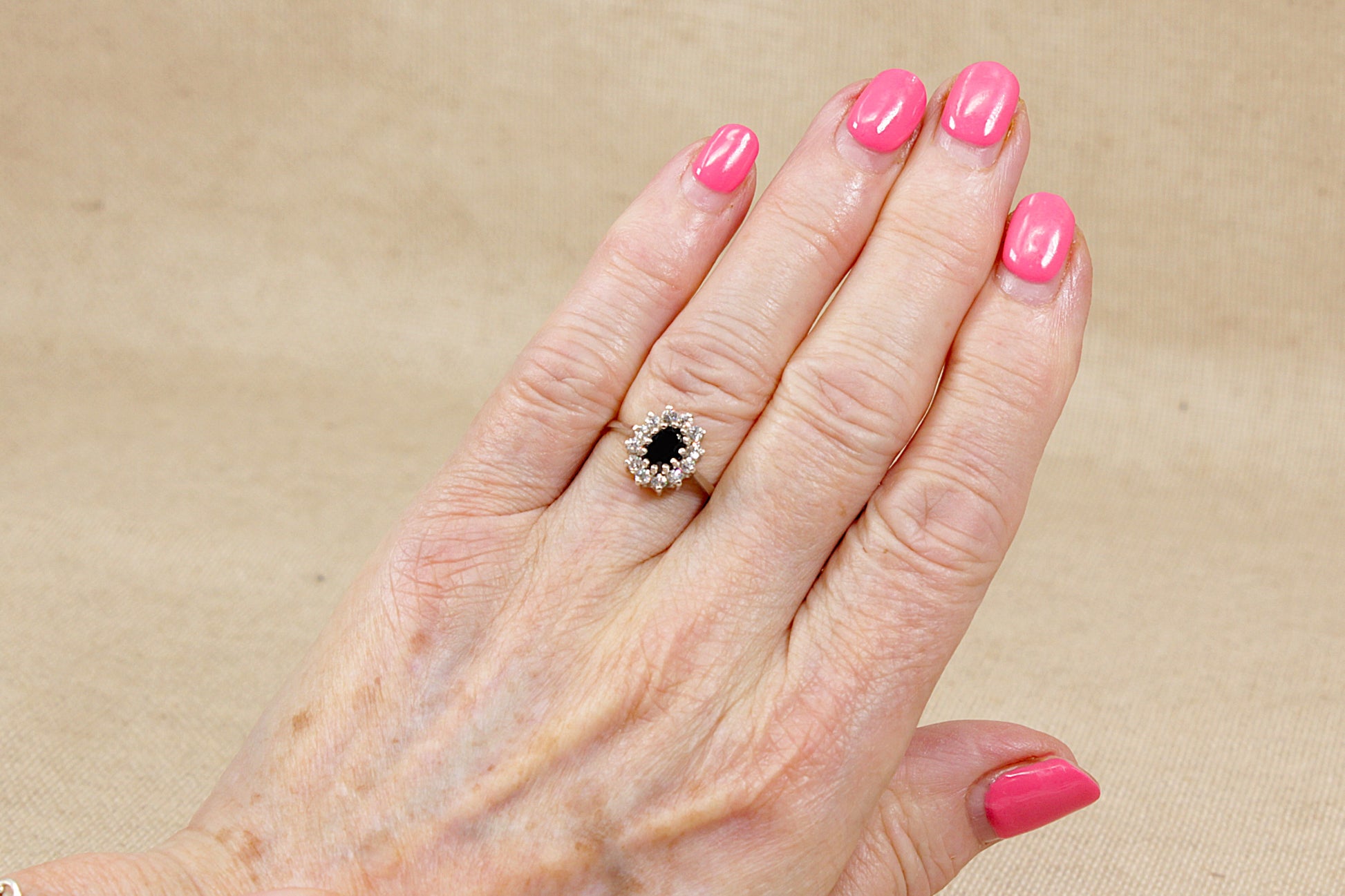 Surrounding the sapphire is a sparkling halo of cubic zirconia stones, adding brilliance and enhancing the classic cluster silhouette.
