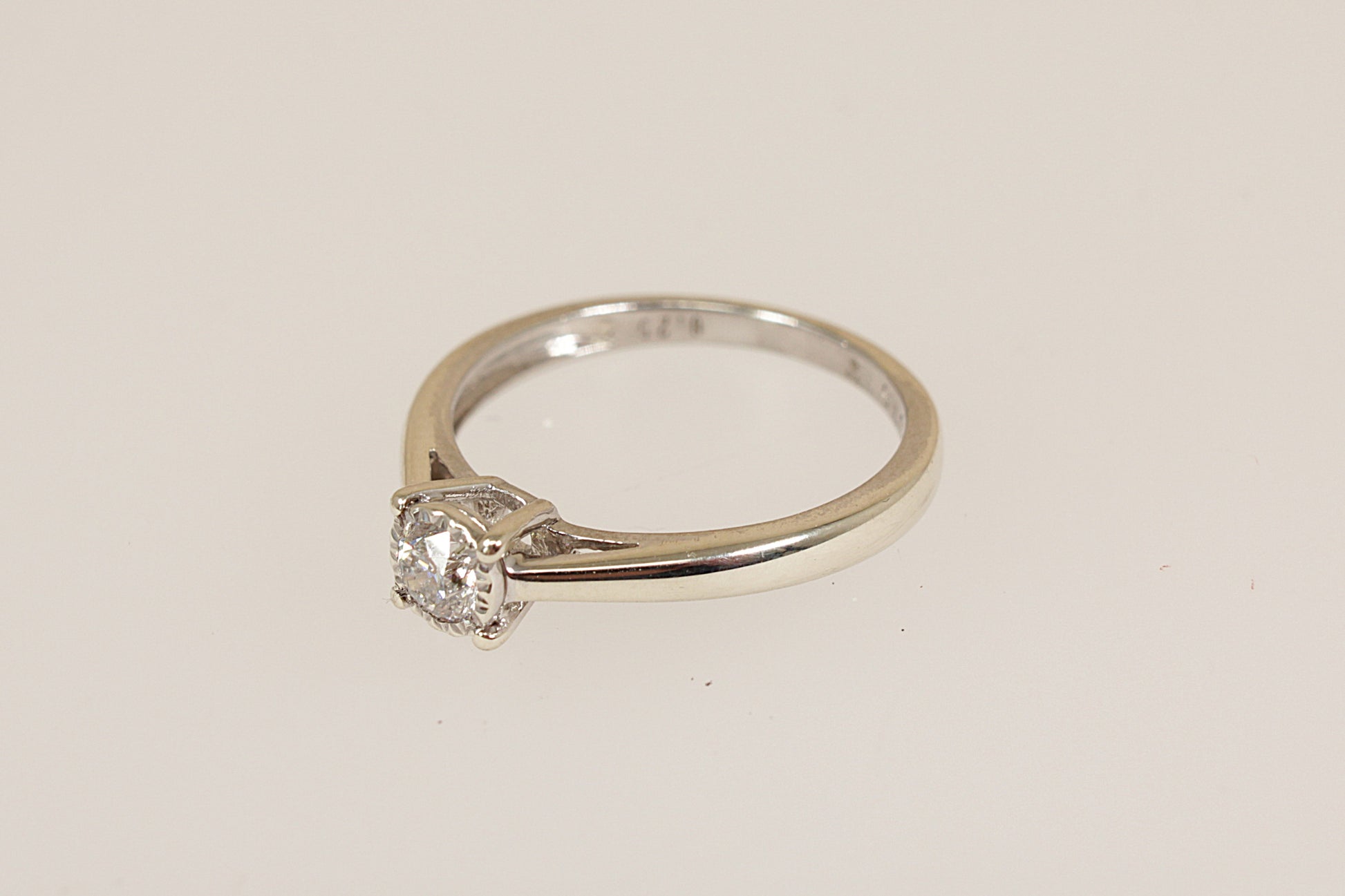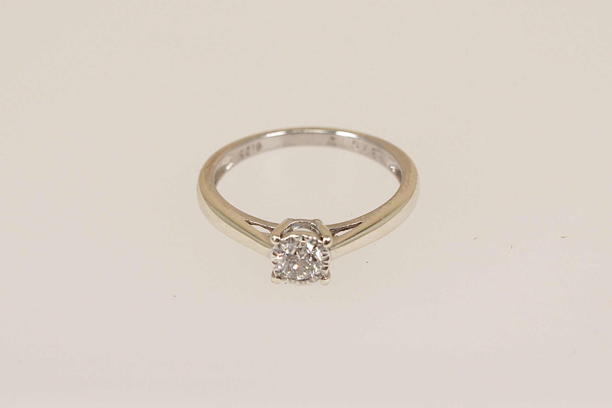 The diamond sparkles beautifully, enhanced by the ring’s gracefully sloping shoulders and smooth polished band. Inside the band, it is stamped 0.25 for the diamond weight and bears Sheffield hallmarks along with the maker’s mark WJJ, reflecting fine craftsmanship and timeless style.